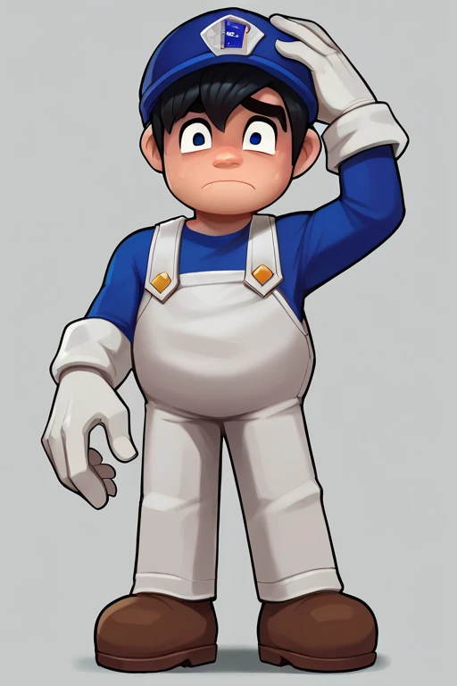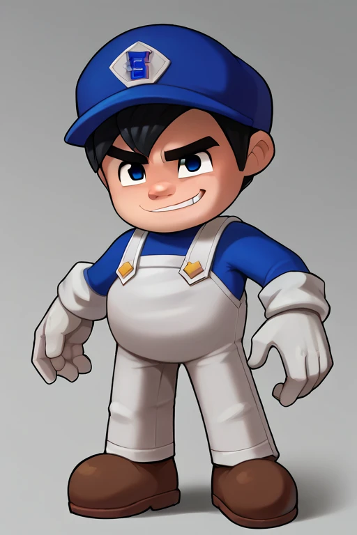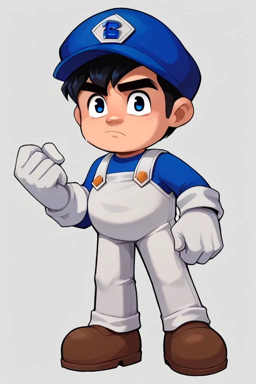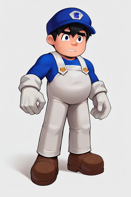 Prompt: SMG4, Black Hair, Blue Eyes, Blue Hat, Blue Shirt, White Overalls, White Gloves, Brown Shoes