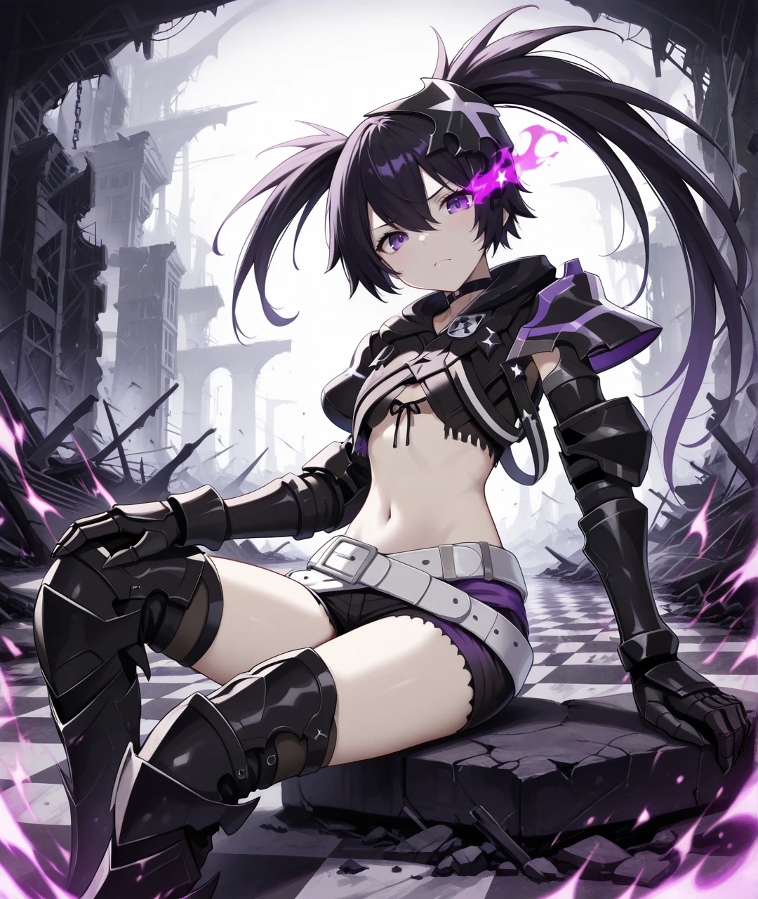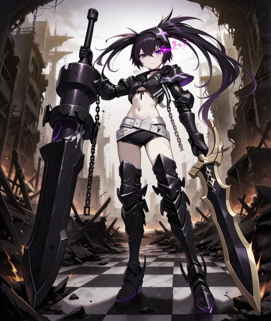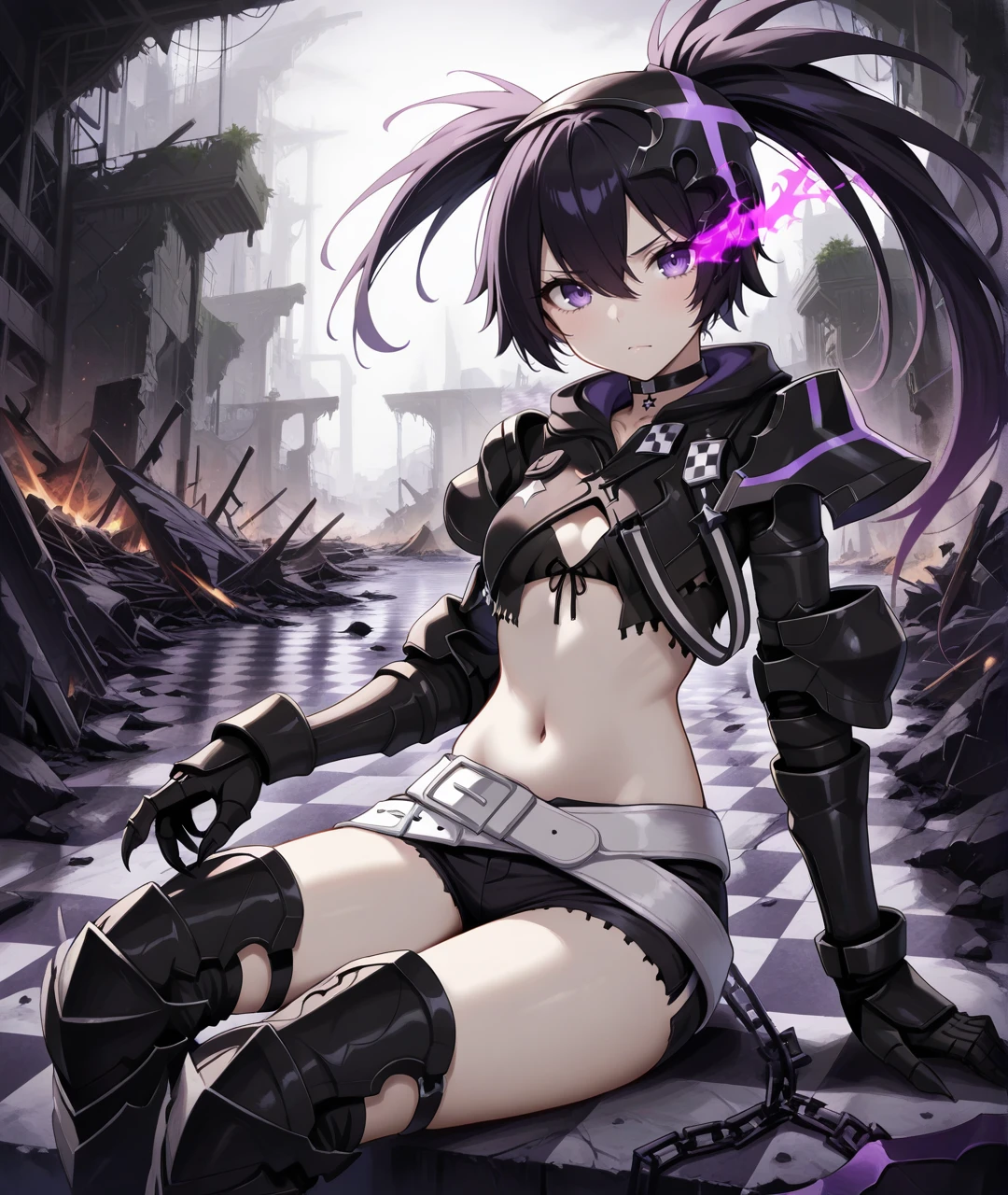 Character Tags: IBRSBase, pale skin, purple eyes, flaming eye, purple flame, black hair, long hair, twintails, uneven twintails, headgear, black choker, small breasts, scar, stitches, chains, star (symbol), armor, black jacket, cropped jacket, black crop top, midriff, navel, arm armor, black gauntlets, claws, black shorts, short shorts, two belts, white belt, loose white belt, black tighhighs, black armored legwear, thigh boots, black armored boots,