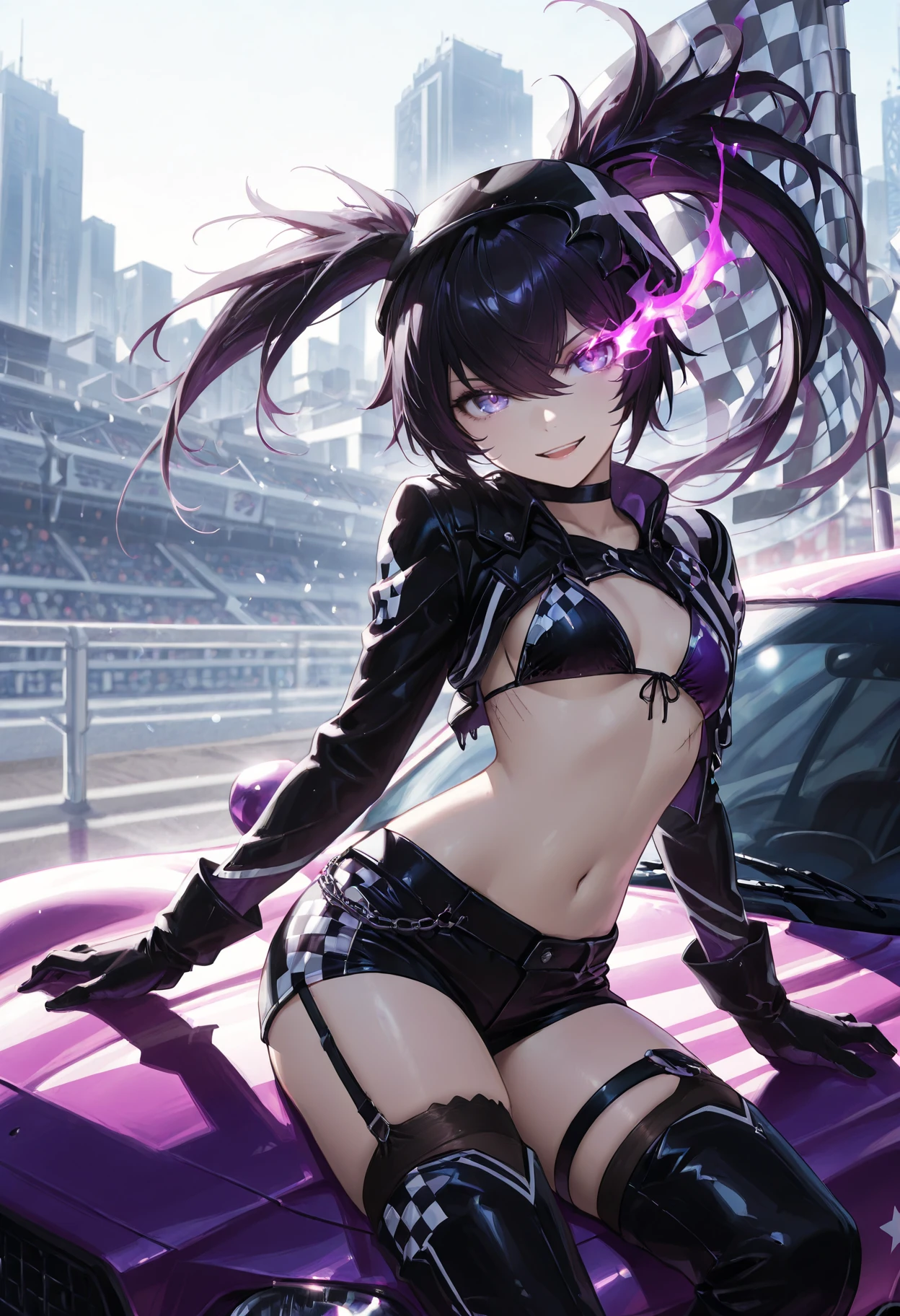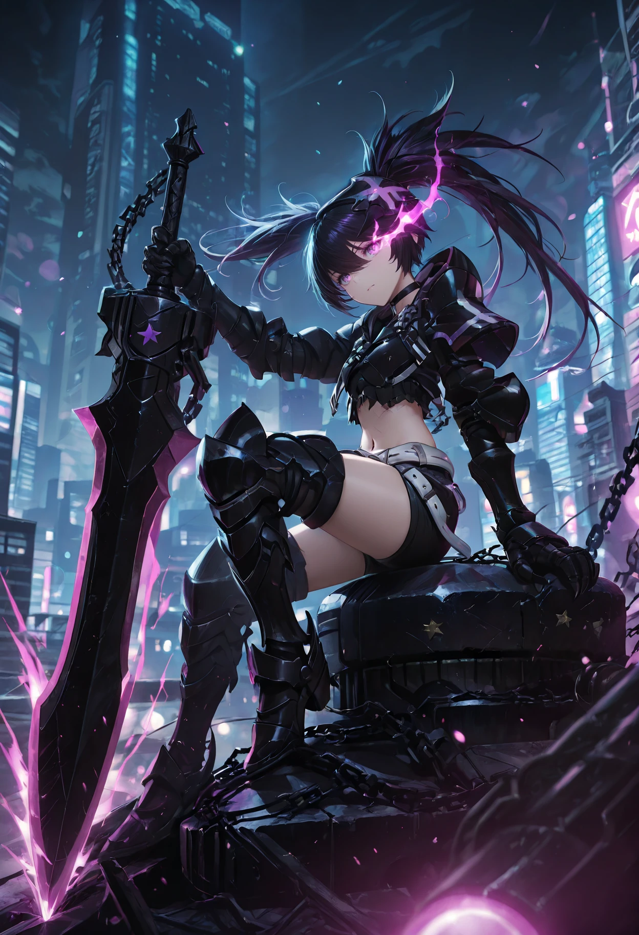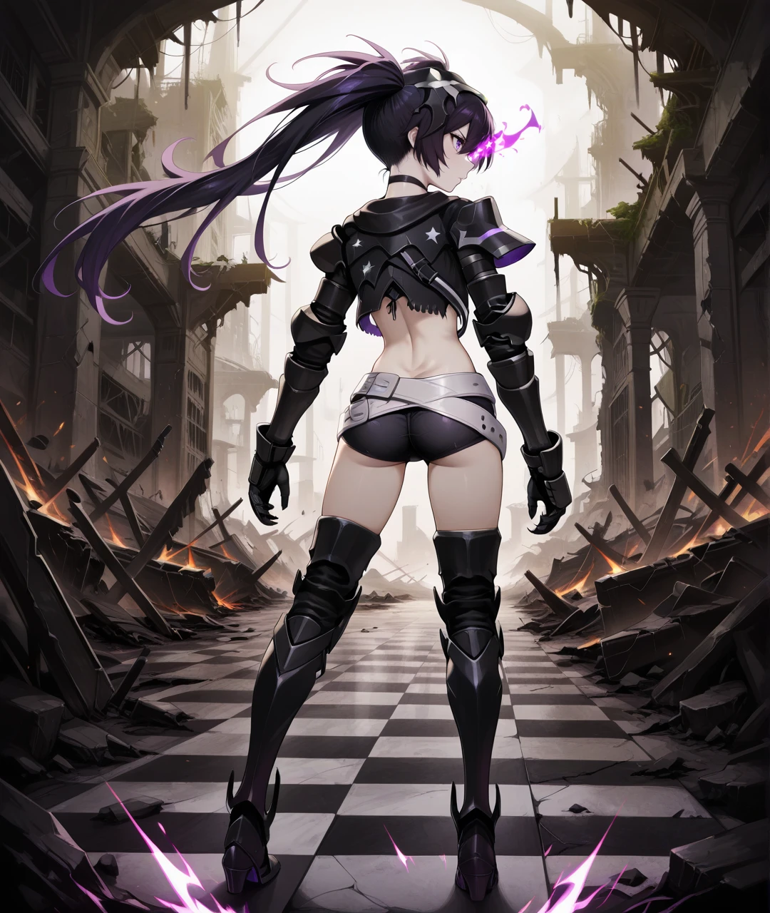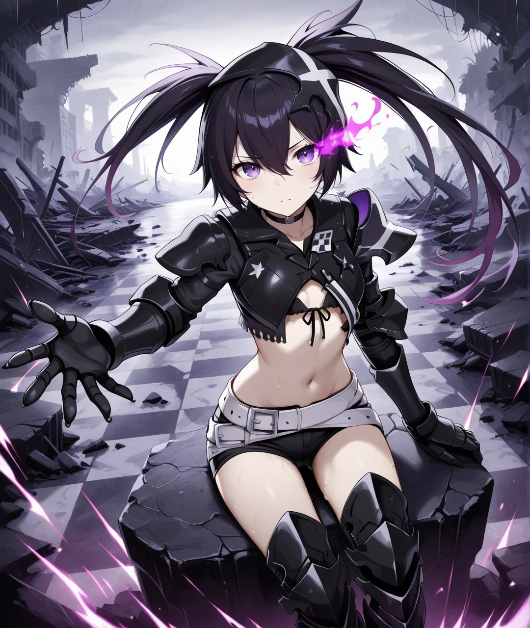 Character Tags: IBRSBase, pale skin, purple eyes, flaming eye, purple flame, black hair, long hair, twintails, uneven twintails, headgear, black choker, small breasts, scar, stitches, chains, star (symbol), armor, black jacket, cropped jacket, black crop top, midriff, navel, arm armor, black gauntlets, claws, black shorts, short shorts, two belts, white belt, loose white belt, black tighhighs, black armored legwear, thigh boots, black armored boots,