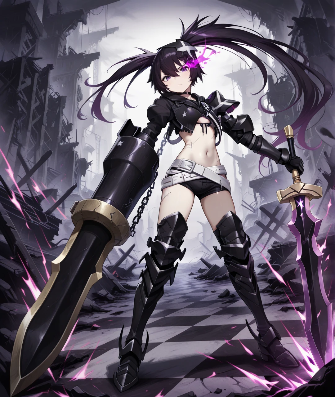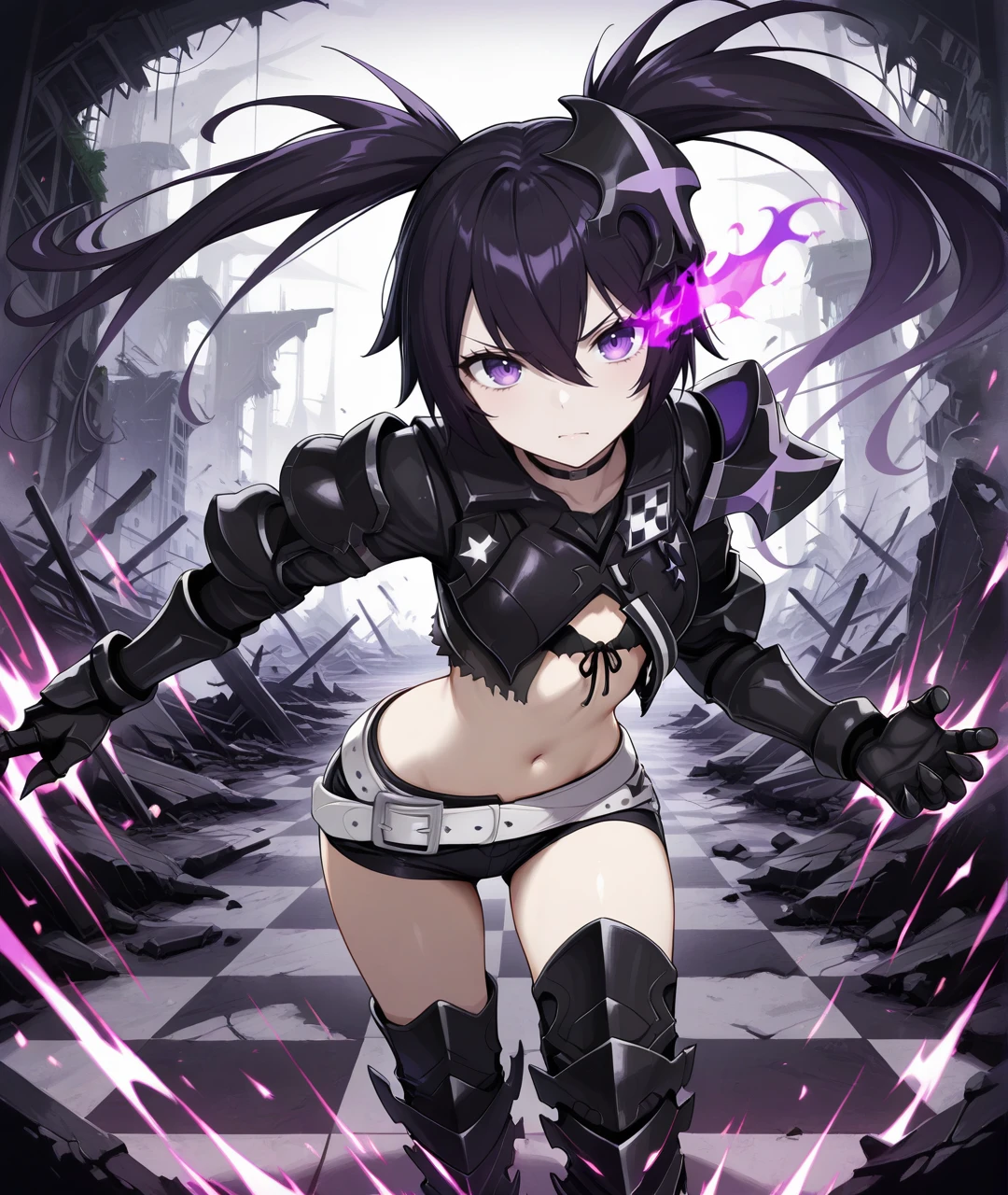 IBRSBase, pale skin, purple eyes, flaming eye, purple flame, black hair, long hair, twintails, uneven twintails, headgear, black choker, small breasts, scar, stitches, chains, star (symbol), armor, black jacket, cropped jacket, black crop top, midriff, navel, arm armor, black gauntlets, claws, black shorts, short shorts, two belts, white belt, loose white belt, black tighhighs, black armored legwear, thigh boots, black armored boots,