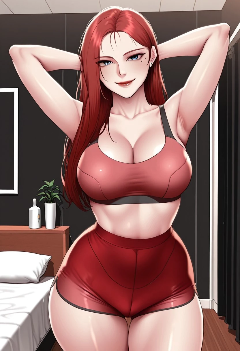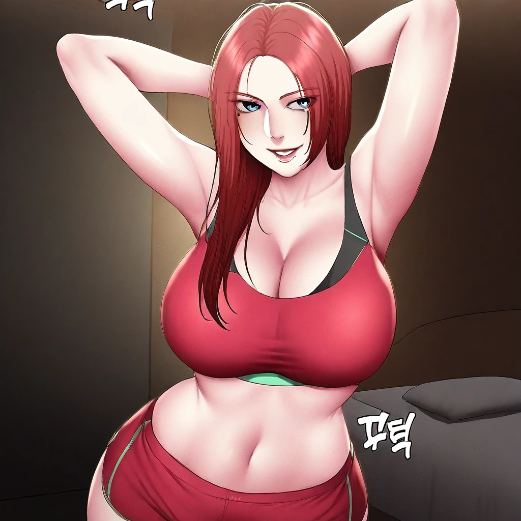 Bae Hye-Jung: bae_hye-jung, beautiful red hair, beautiful low ponytail, huge and shaggy breasts, beautiful light blue eyes,
