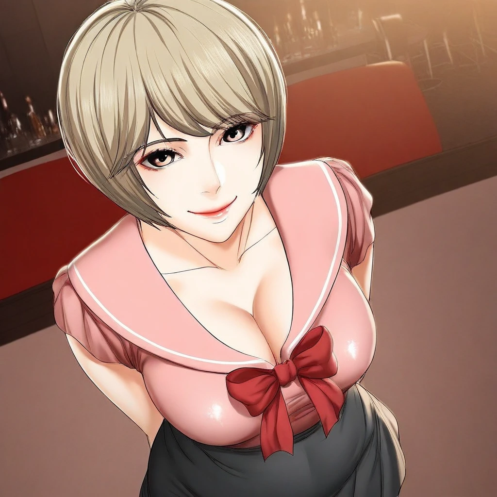 Sun-Bin: sun-bin, beautiful light blonde hair, beautiful short bob haircut, bangs, huge and shaggy breasts, beautiful light brown eyes,