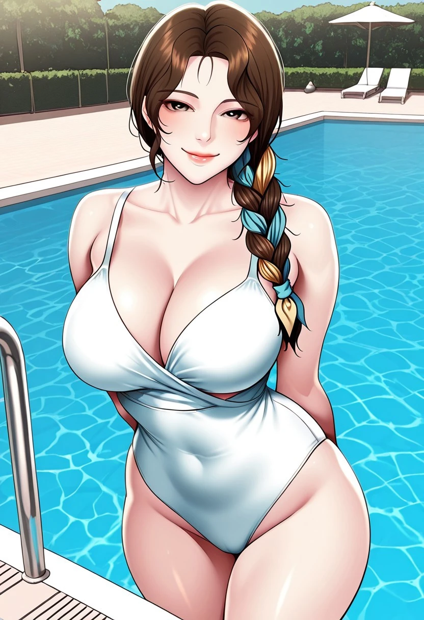 Cho Mi-Kyung: cho_mi-kyung, beautiful brown hair, single hair braid with light blue scarf, hair over shoulder, huge and shaggy breasts, beautiful brown eyes,