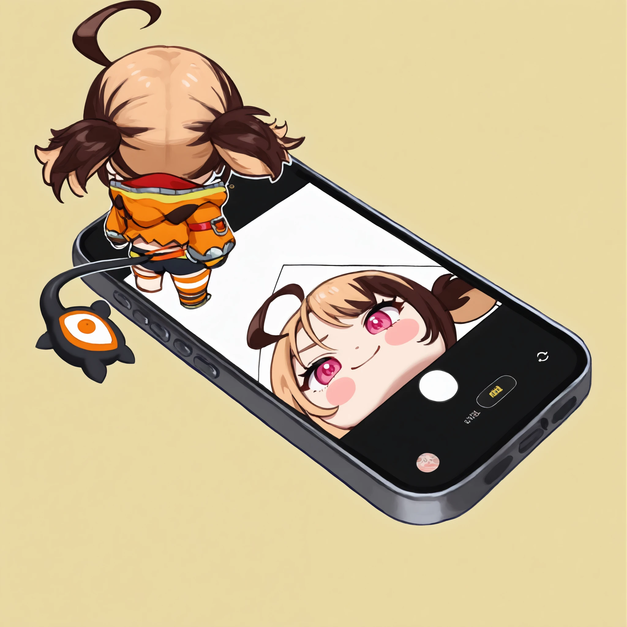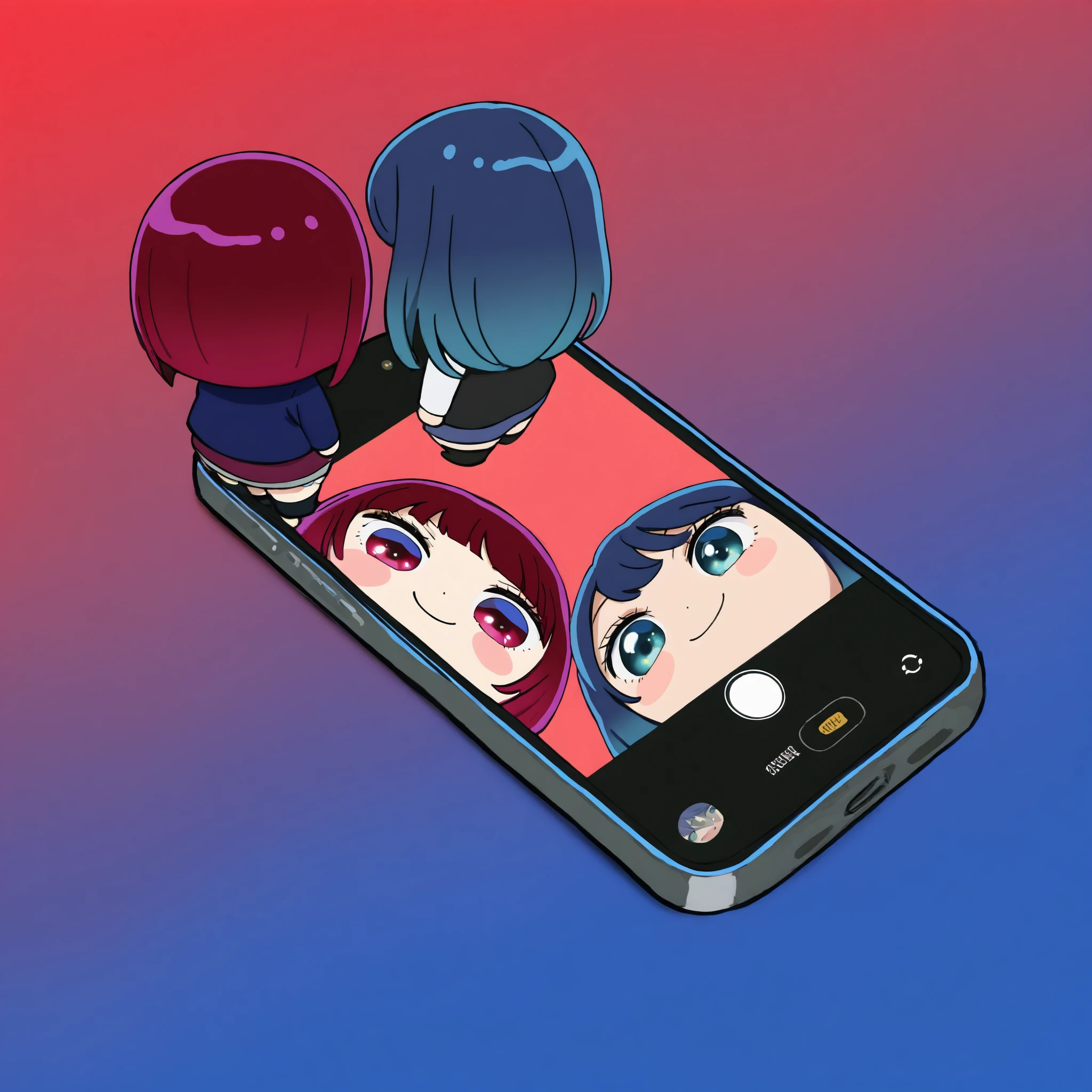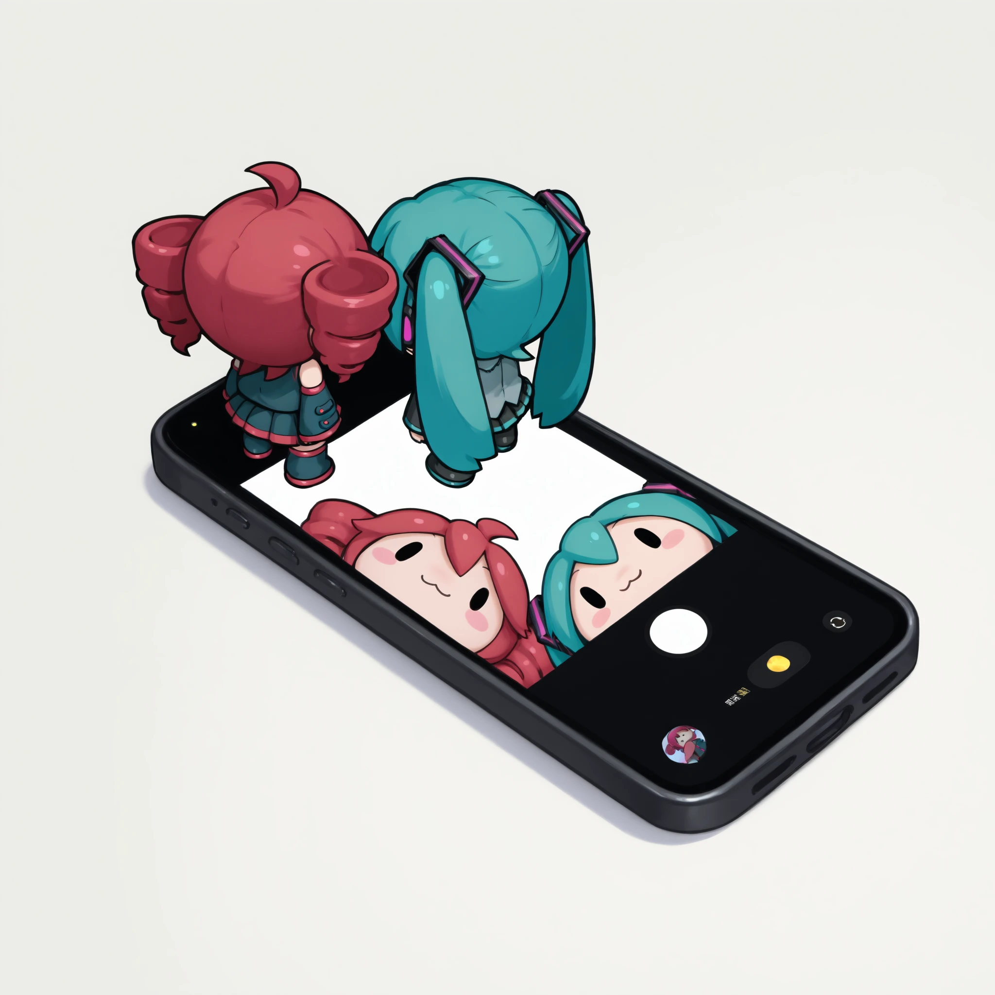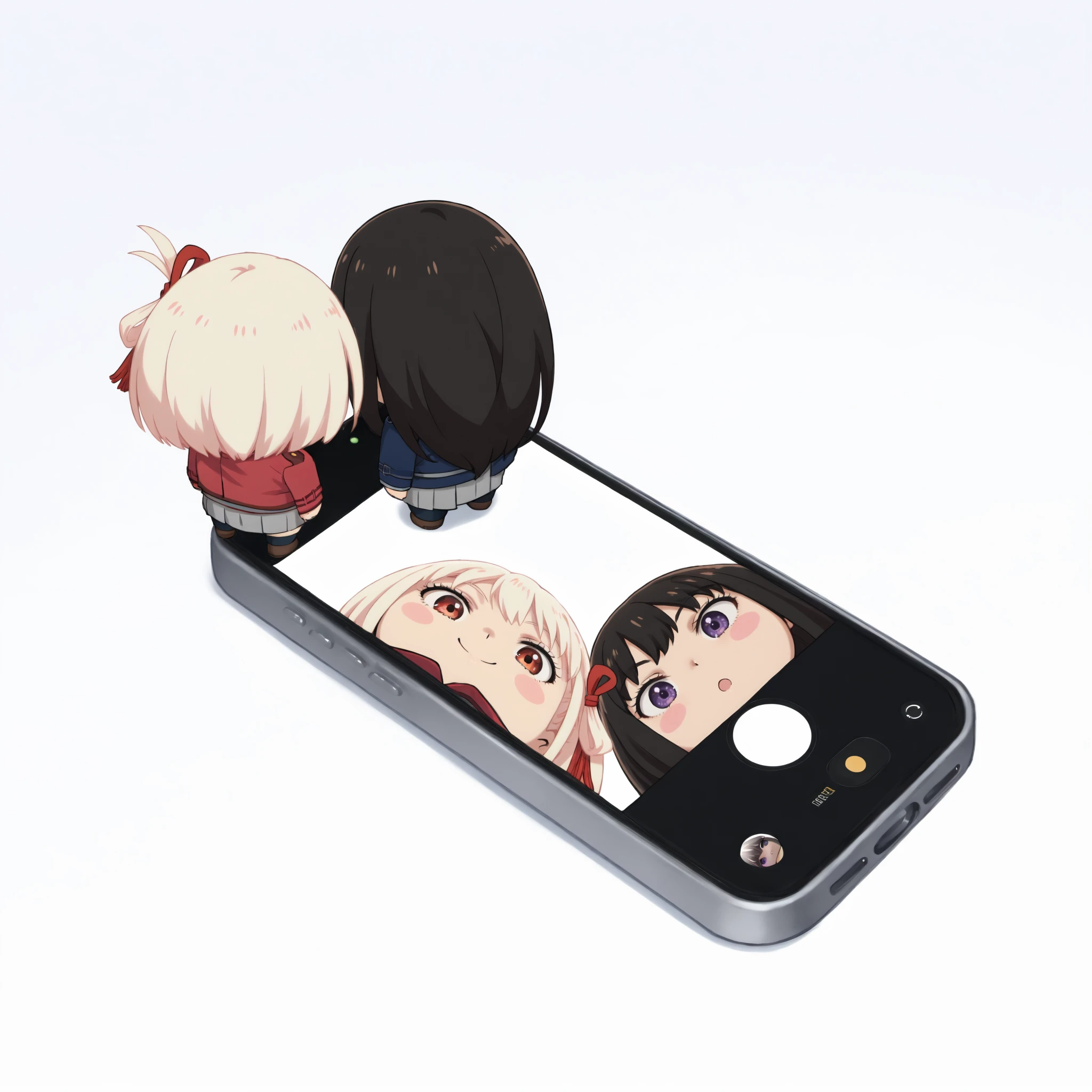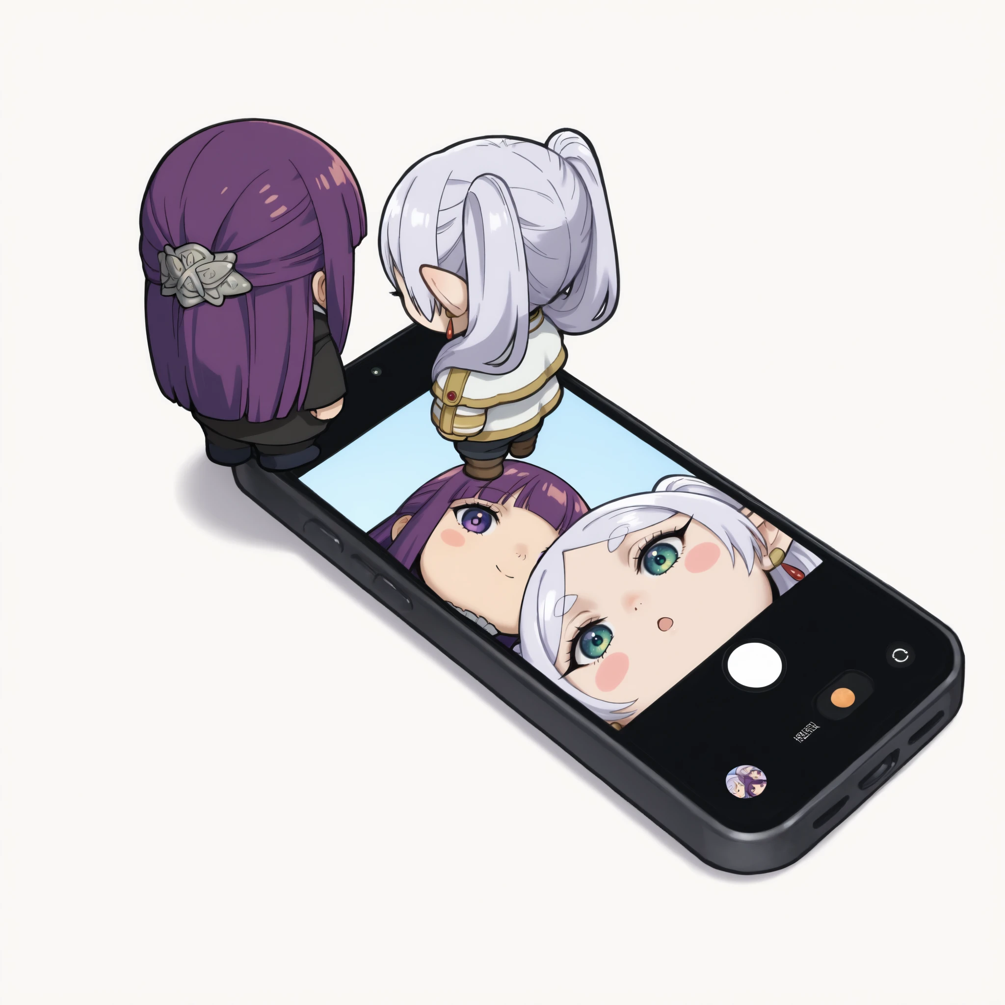 Two chibi figures looking down the smartphone with the camera open