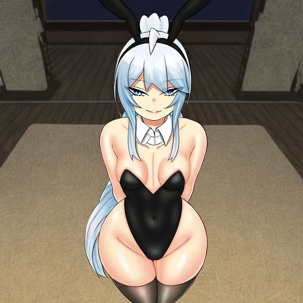 5. ((sexy ?????? obscene bunnygirl outfit, sexy ?????? obscene off-shoulder black latex leotard, sexy ?????? white thighhighs, black alice band with black fake bunny ears, separate white bunnygirl collar, ))