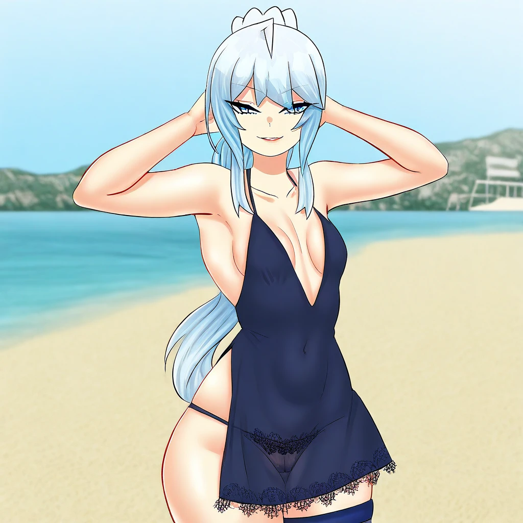 1b. ((sexy ?????? sheer black leotard, blue thighhighs, ))