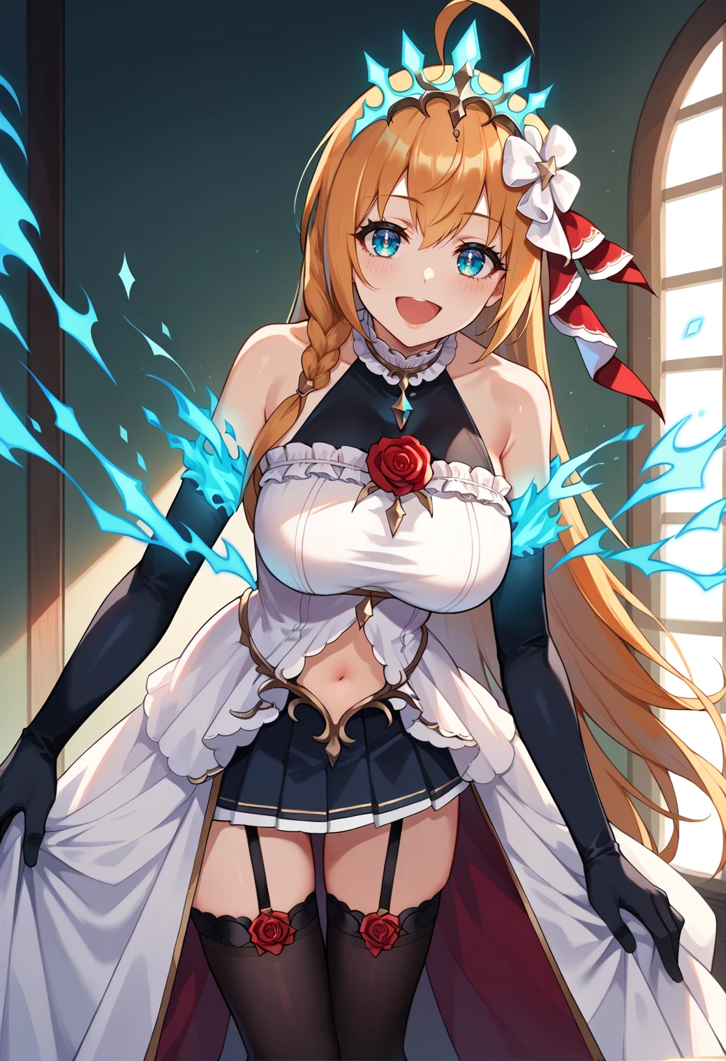 pecooverdress, blue tiara, blue fire, hair white flower, bare shoulders, black elbow gloves, rose, navel cutout, black skirt, pleated skirt, black thighhighs, garter straps,