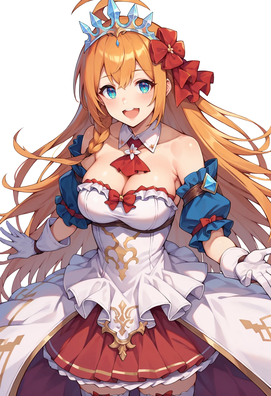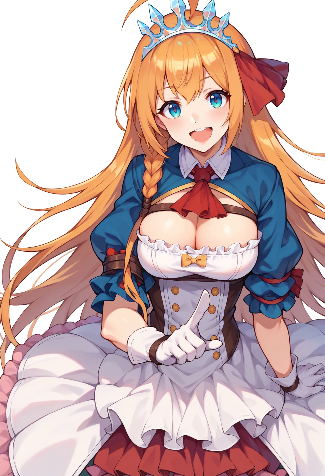 pecodefdress, tiara, hair red ribbon, shrug \(clothing\), puffy short sleeves, red ascot, cleavage, white gloves, red skirt,