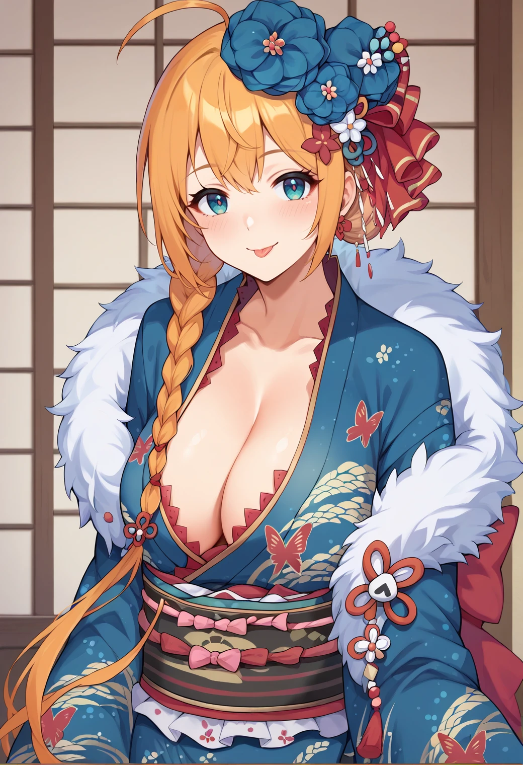 peconewyear, side braid, hair flower, blue flower, hair red ribbon, fur-trimmed kimono, blue kimono, print kimono, butterfly print, sleeves past wrists, sash, obi,