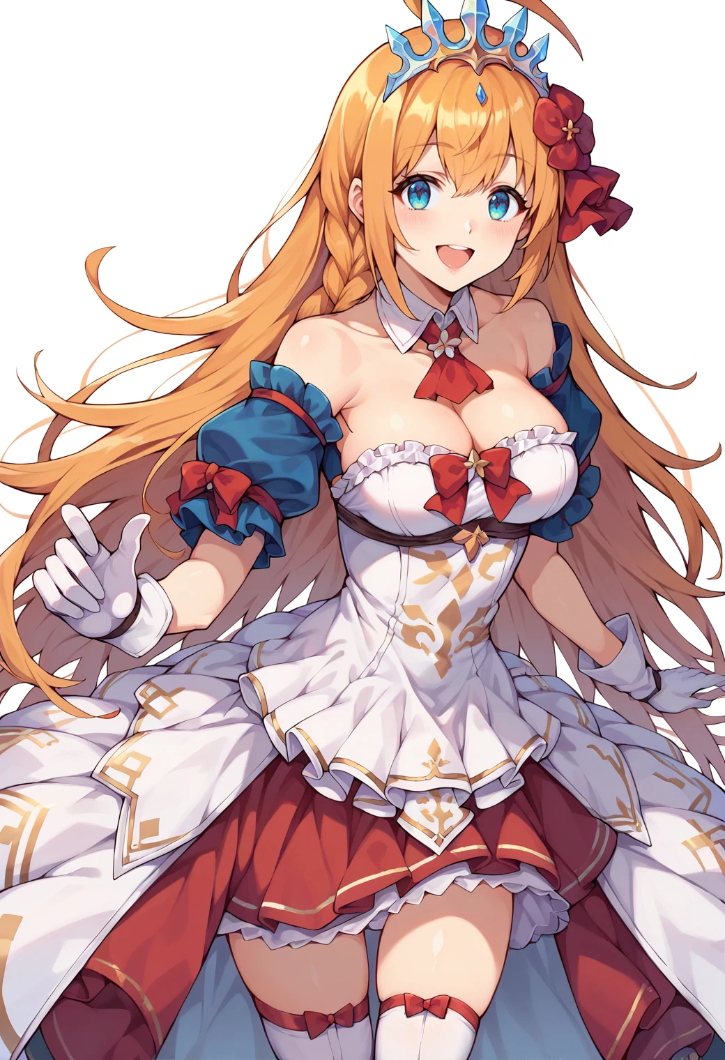 pecoprifdress, tiara, hair red ribbon, hair red flower, cleavage, puffy short sleeves, detached collar, sleeves cutout, bare shoulders, white gloves, red skirt, thighhighs, white footwear,