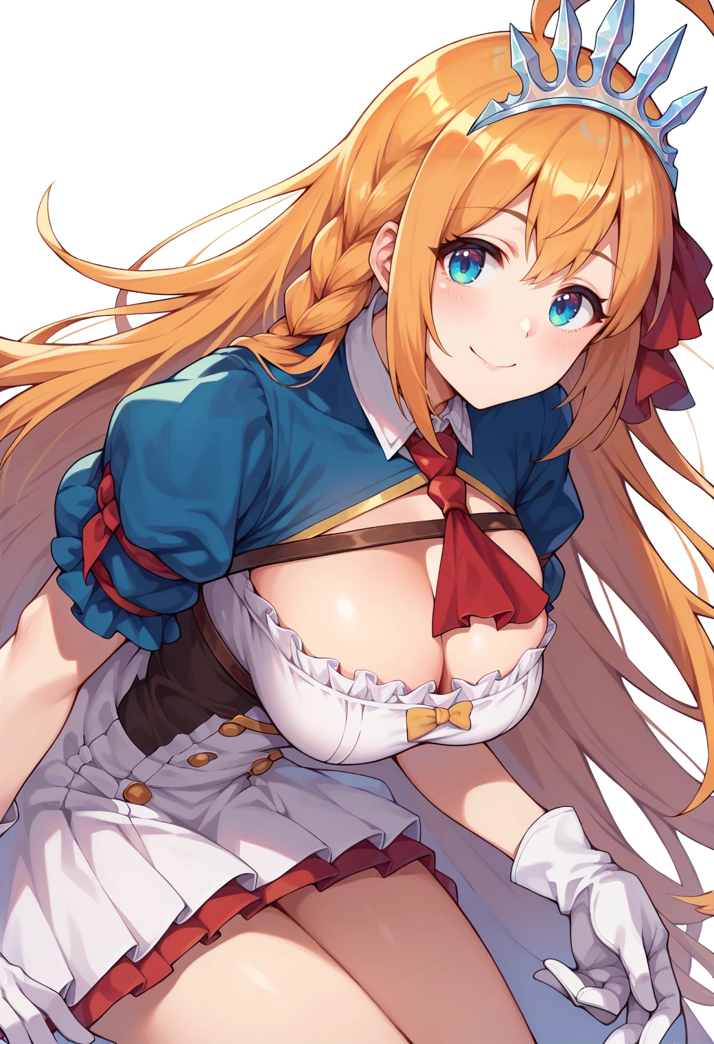 pecodefdress, tiara, hair red ribbon, shrug \(clothing\), puffy short sleeves, red ascot, cleavage, white gloves, red skirt,Default Clothes with pauldrons (for this first version it became gacha):