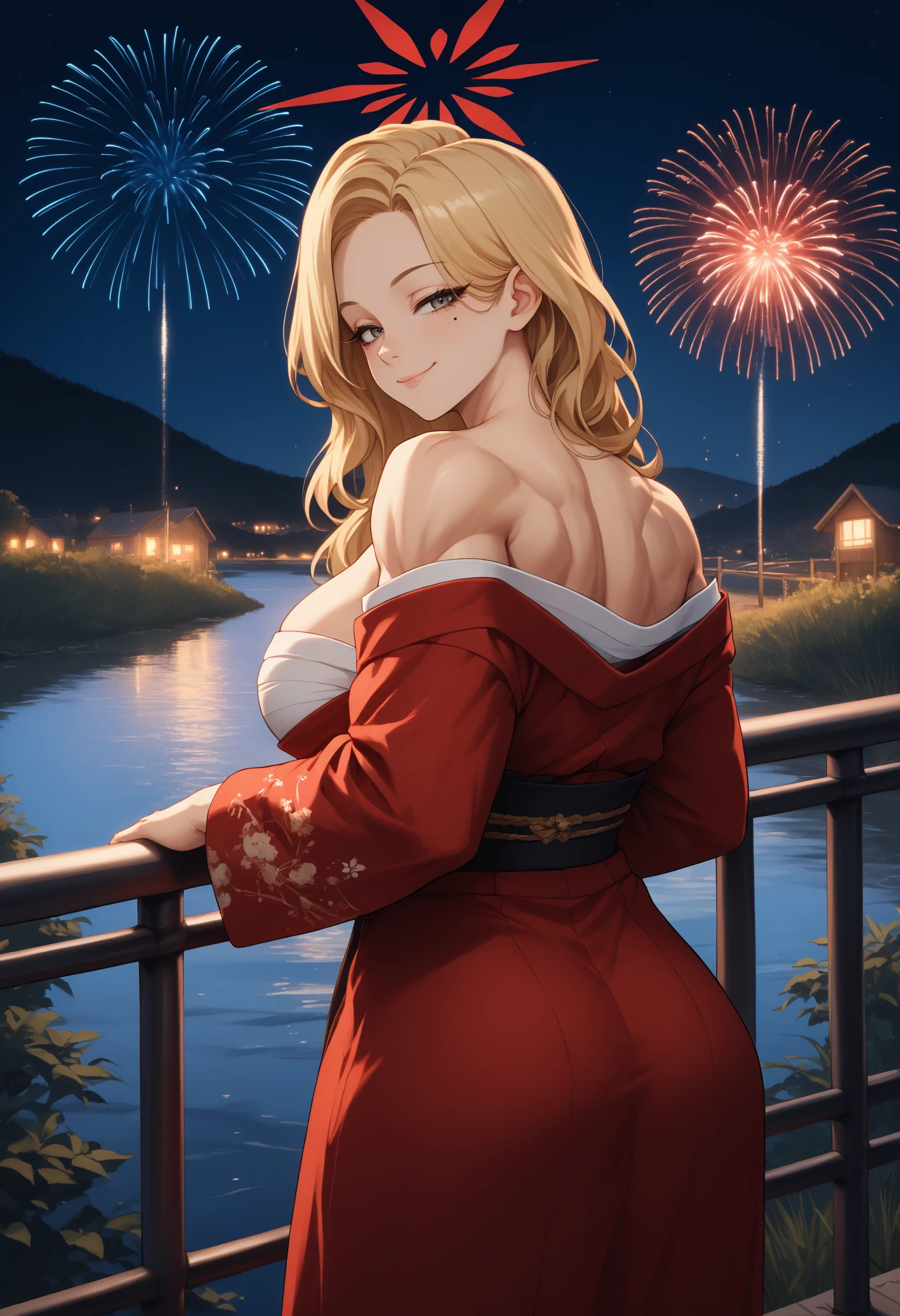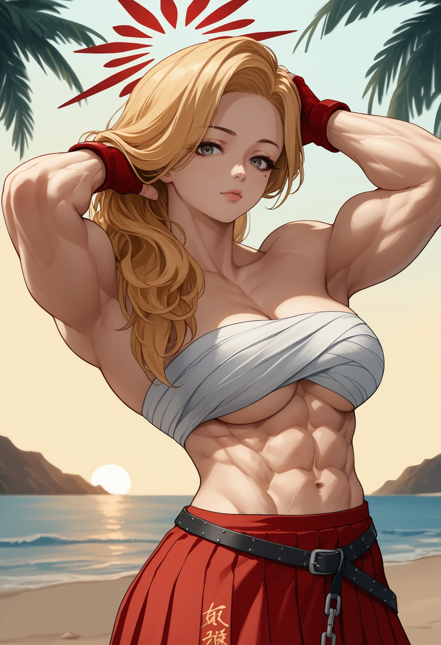 Always needed: "akekur, grey eyes, blonde hair, long hair, mole under eye, red halo, large breasts, muscular female"
