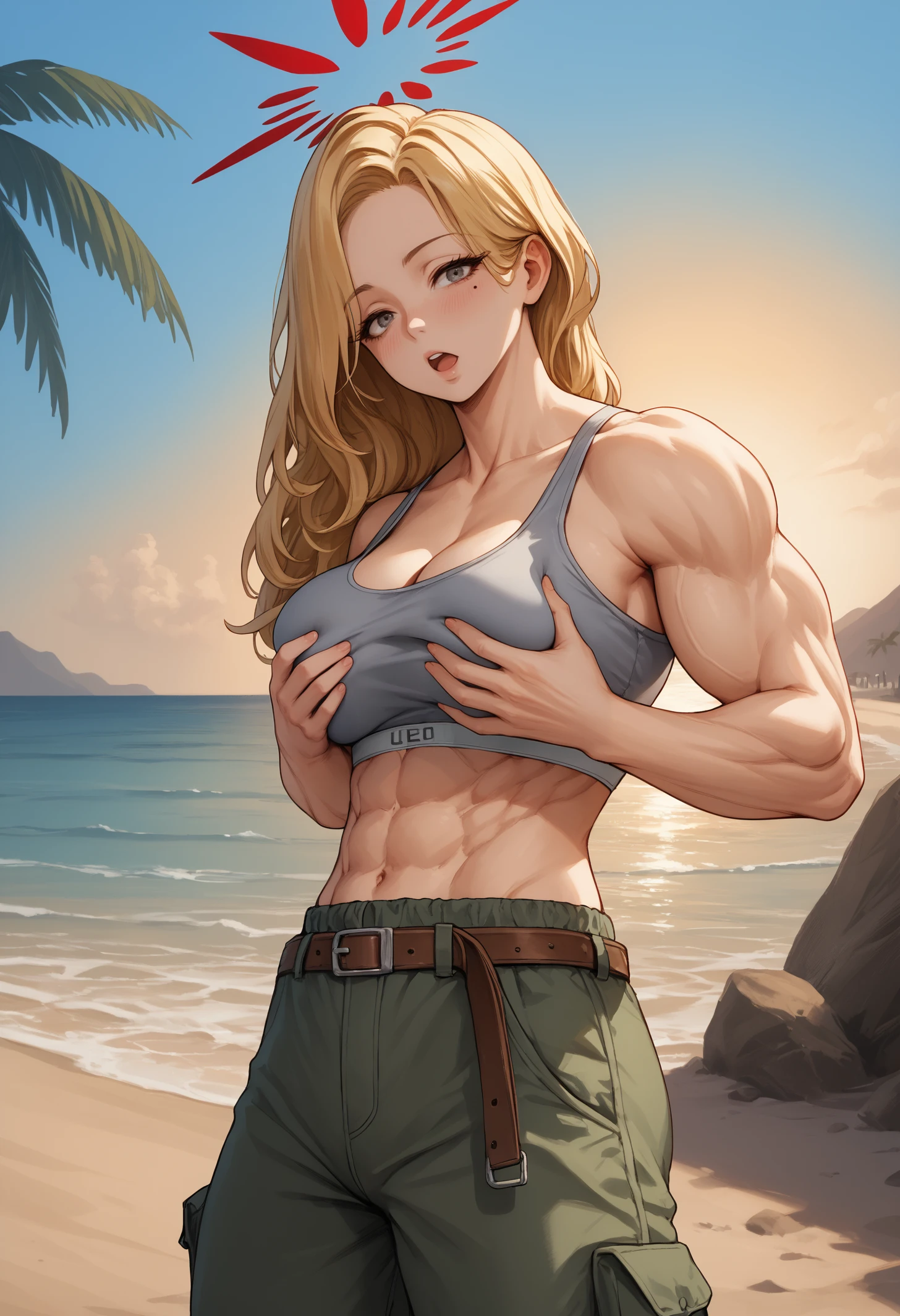 akekur, grey eyes, blonde hair, long hair, mole under eye, red halo, large breasts, muscular female