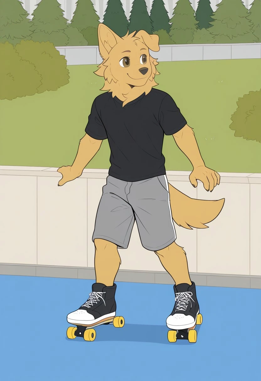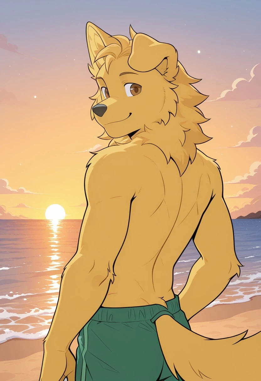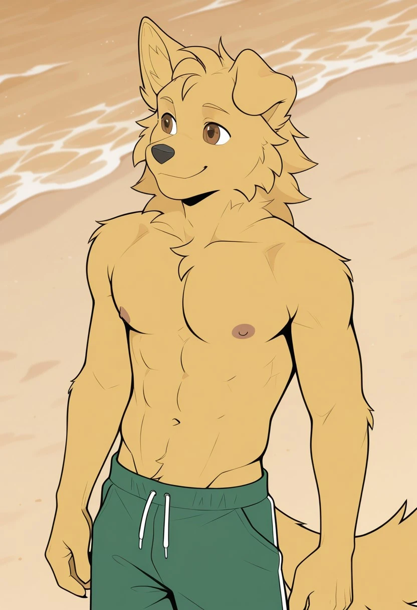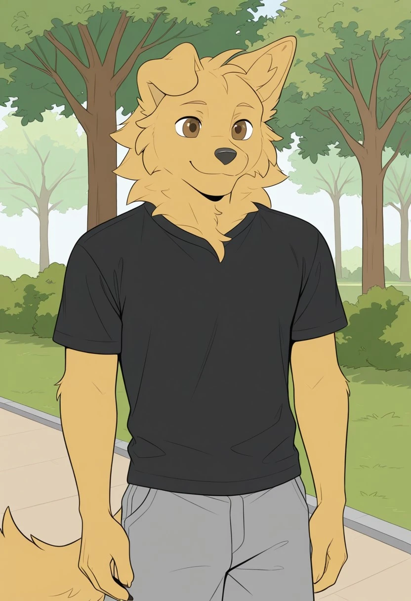 <lora:raygol:1>, Raygol, Anthro,furry, golden retriever,male,solo,one ear down, brown eyes, yellow fur, tail
