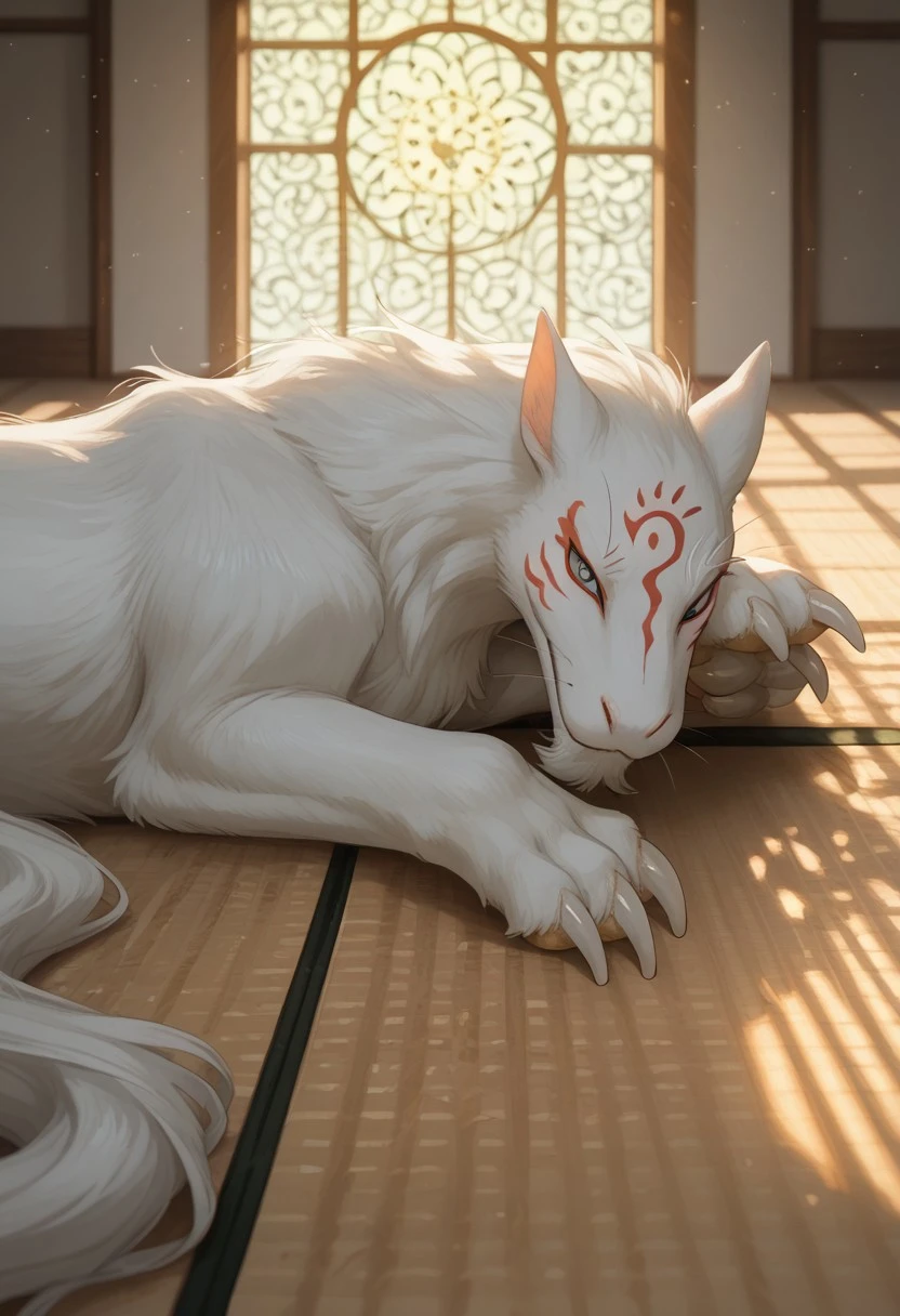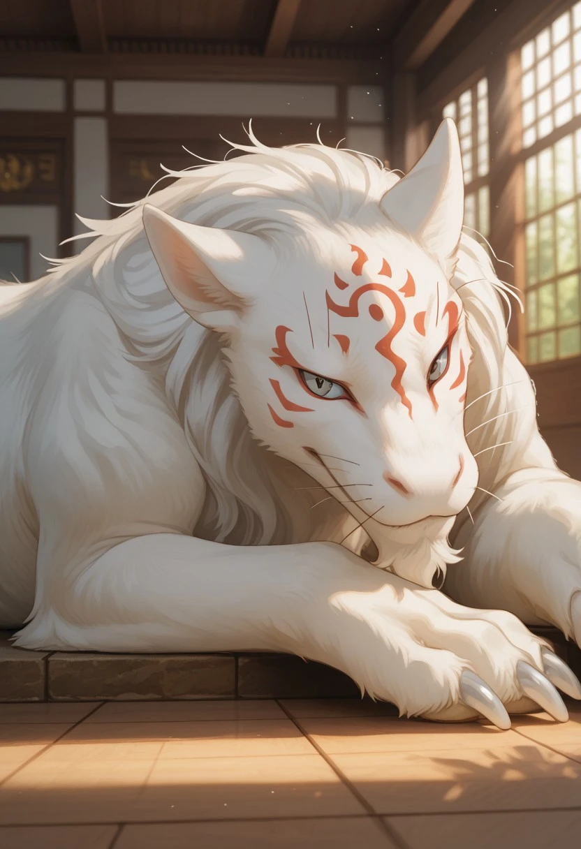 For this character: Madara,mythical feline, long white fur, flowing and unkempt fur, piercing eyes, red markings on forehead, thin and sharp eyebrows, slender body, lean musculature, long bushy tail, pointed ears, sharp claws,