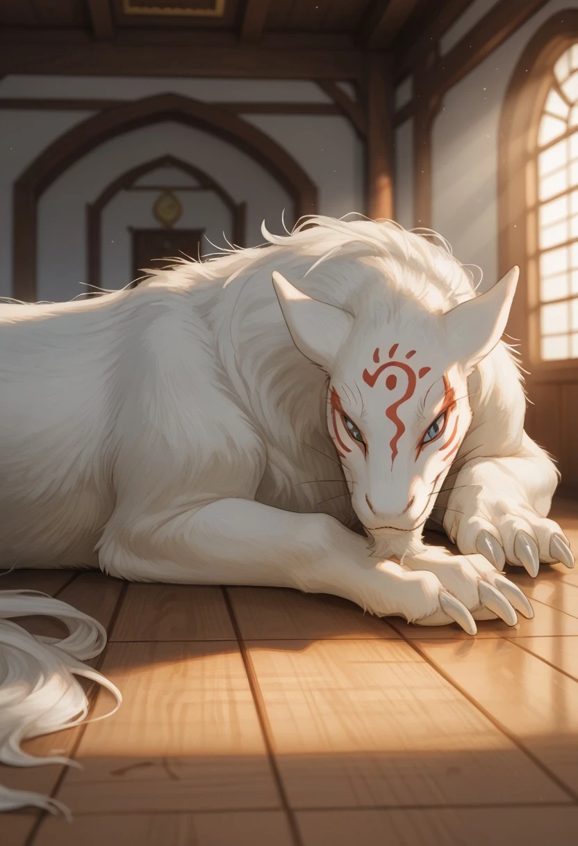 mythical feline, long white fur, flowing and unkempt fur, piercing eyes, red markings on forehead, thin and sharp eyebrows, slender body, lean musculature, long bushy tail, pointed ears, sharp claws,