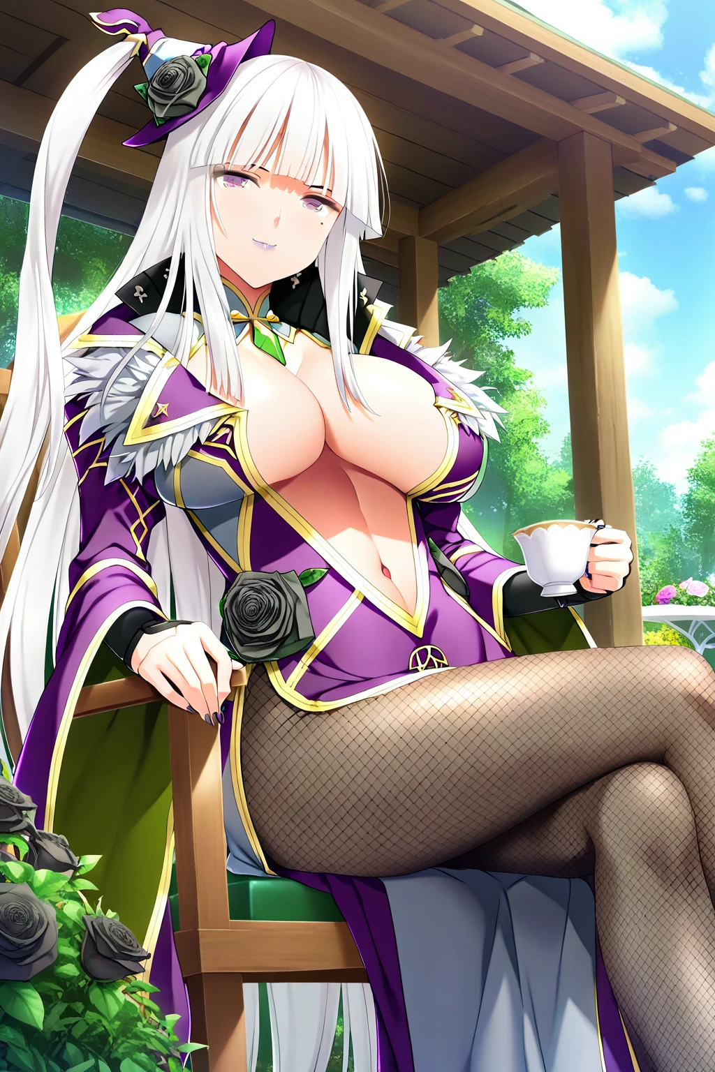 ll_def, gfc_ll, 1girl, solo, purple eyes, white hair, long hair, large breasts, mole under eye, lips, black nails, one side up, mini hat, hair flower, black rose, brooch, purple coat, side slit, center opening, cleavage, navel, wide sleeves, gray dress, fishnet pantyhose, high heels,