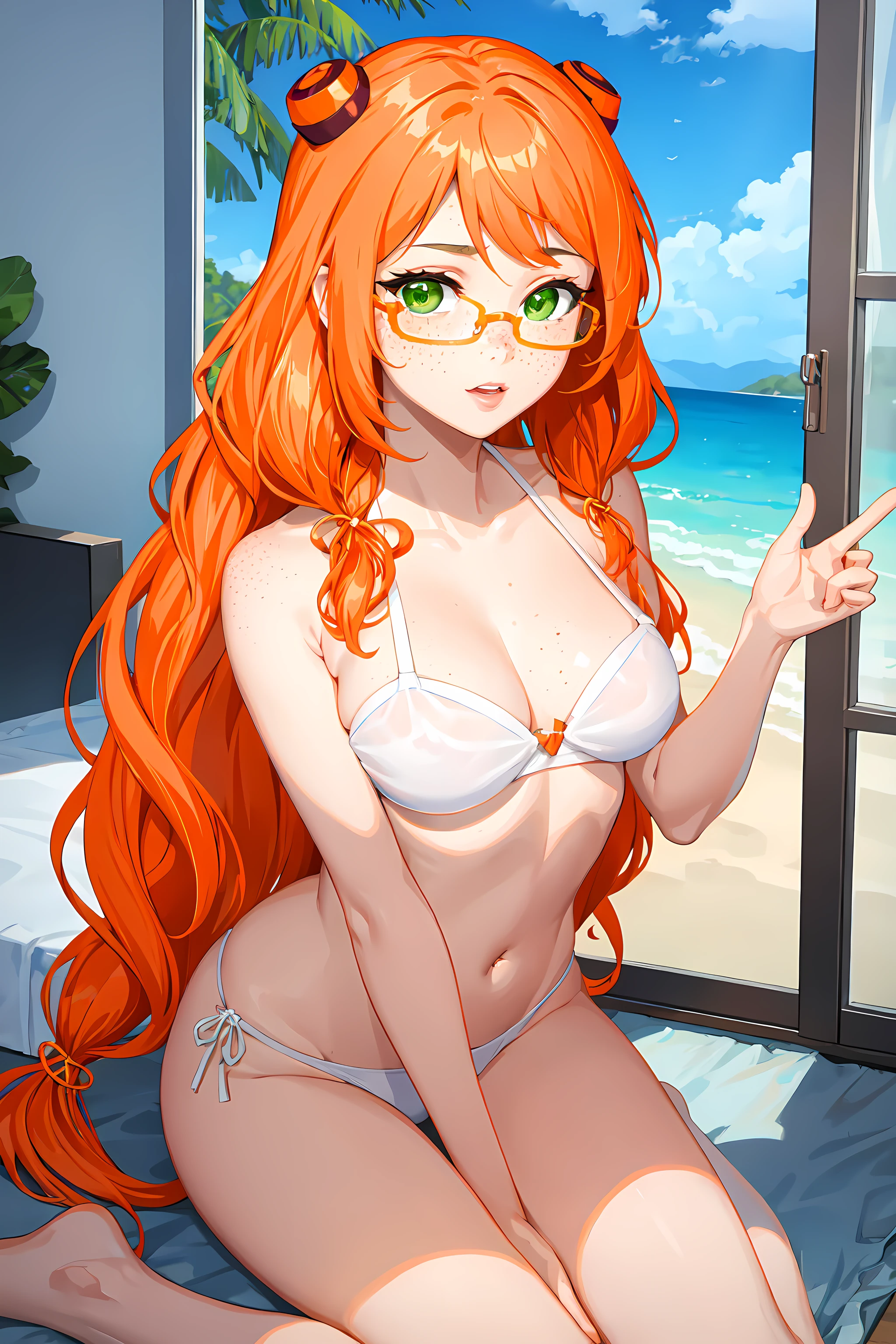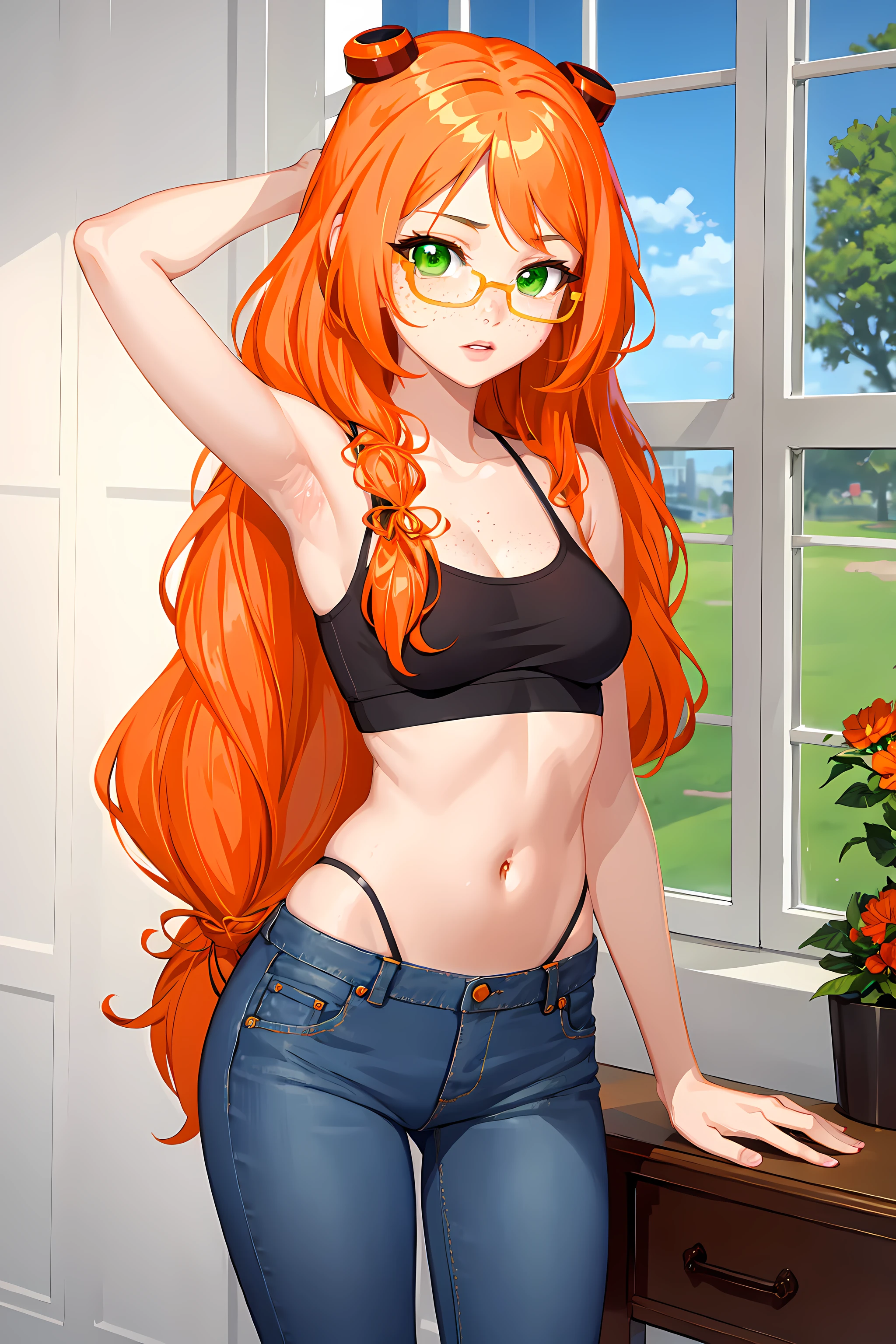 Trigger words: nina, 1girl, solo, glasses, orange hair, long hair, green eyes, freckles
