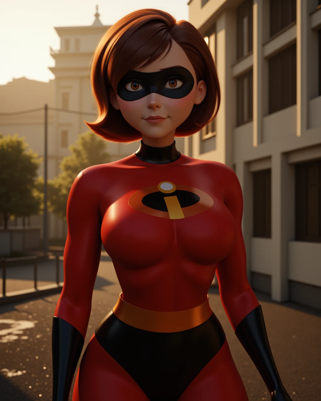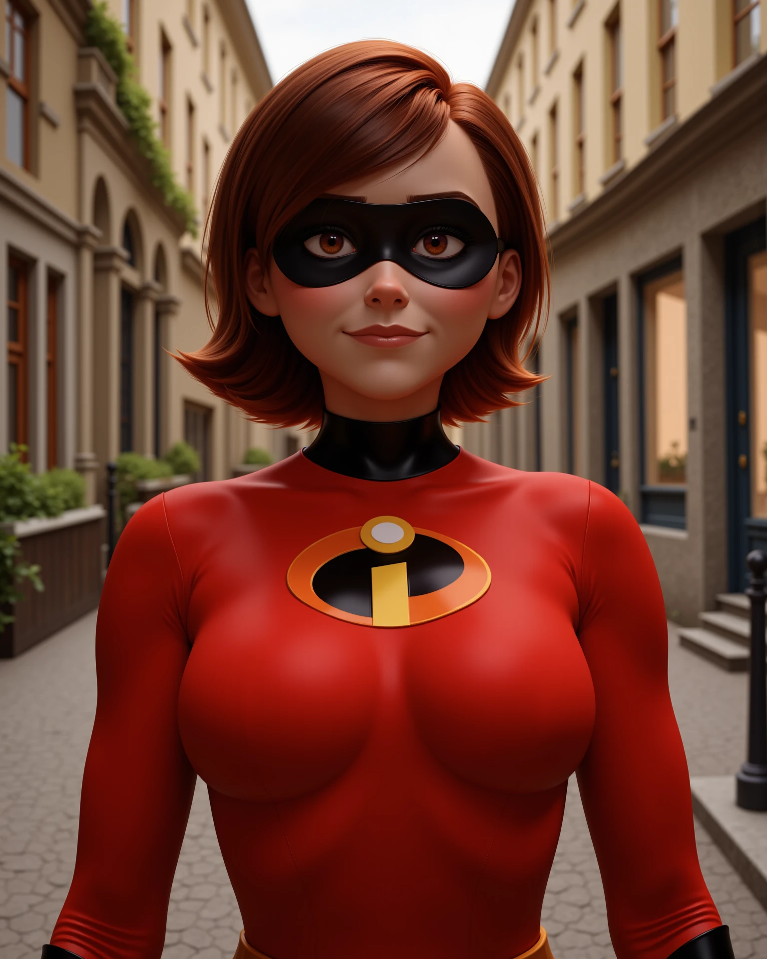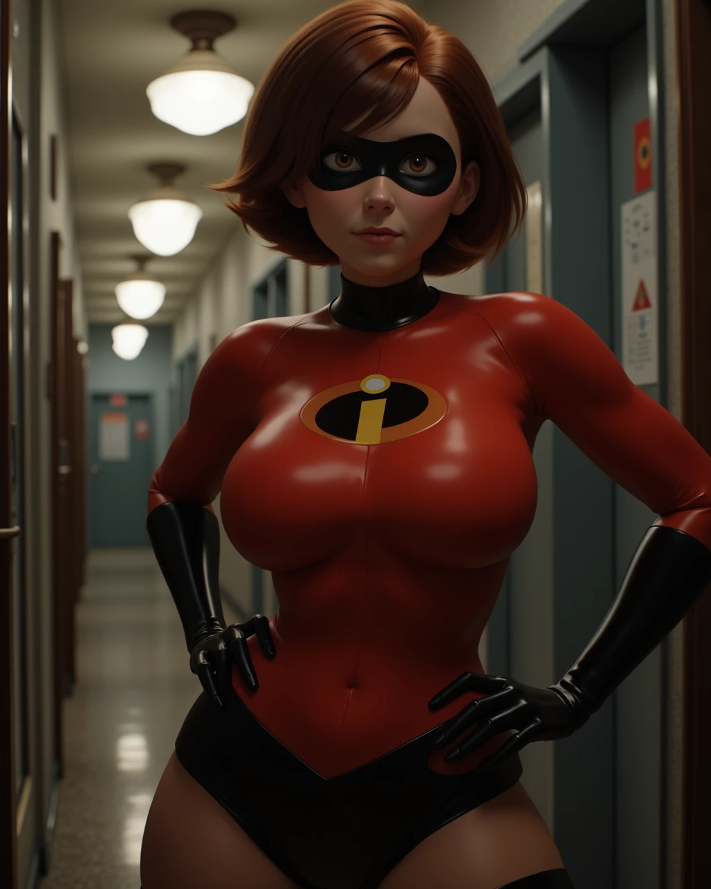 Incredibles Super Suit (Classic Red & Black): Form-fitting red bodysuit with black gloves, boots, and an "i" emblem on the chest, designed for superhero missions.