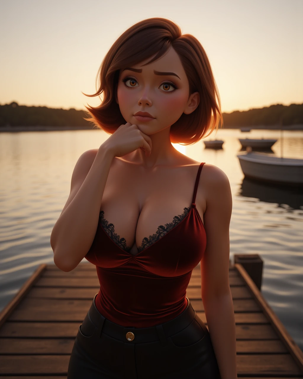 Casual Outfit (The Incredibles 1): Light blue t-shirt, grayish-blue pants, and white sneakers, perfect for her relaxed, stay-at-home look.
