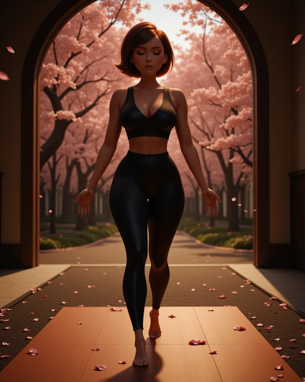 Workout Outfit: Tight black and gray gym attire, including leggings and a fitted top, showcasing her athletic build.