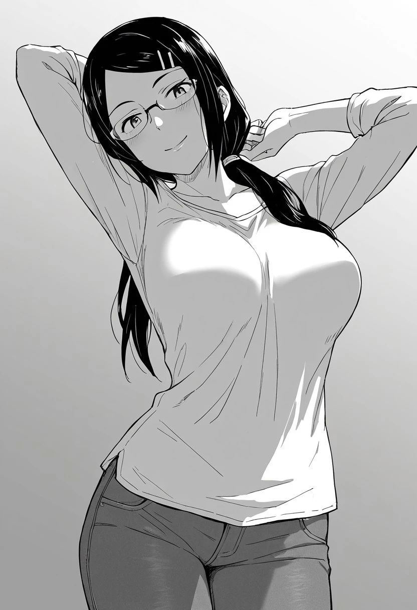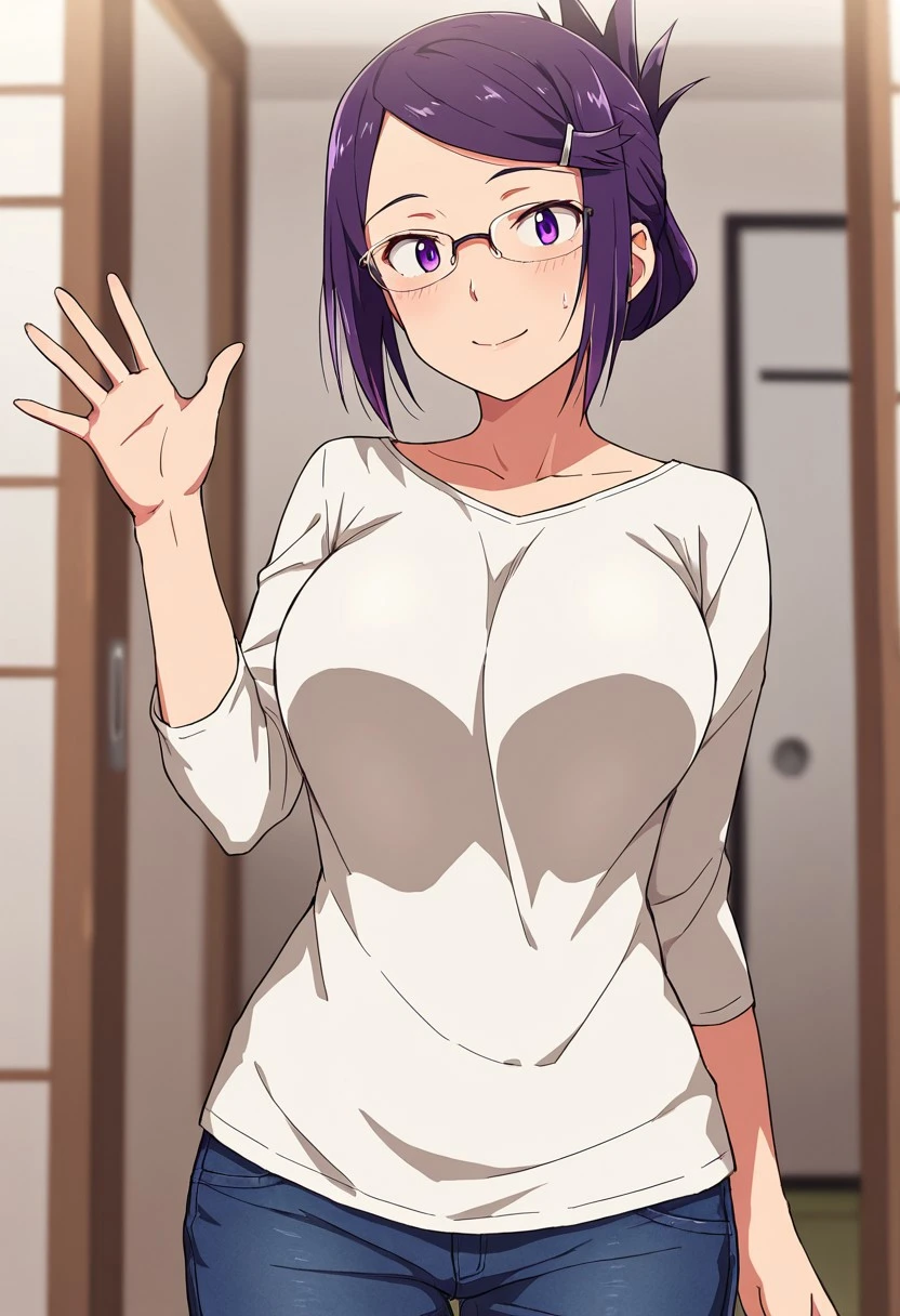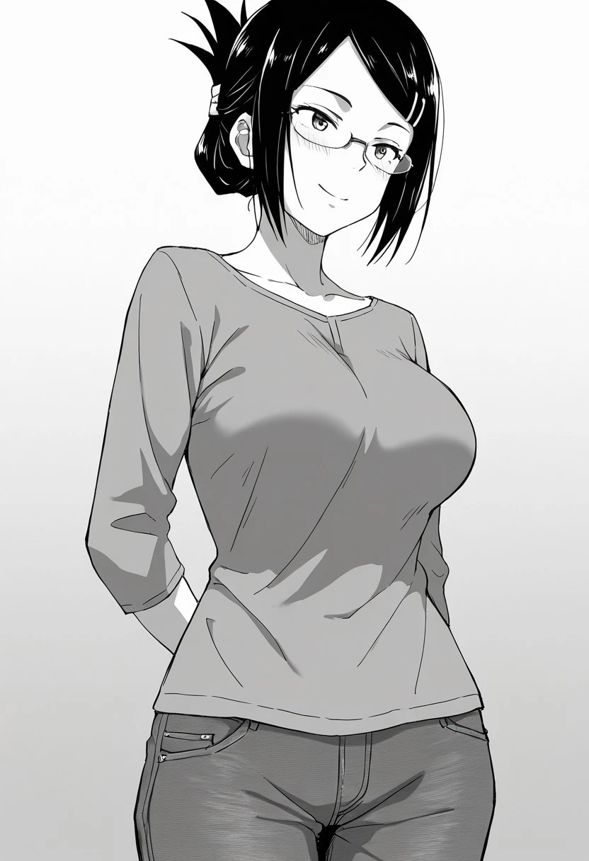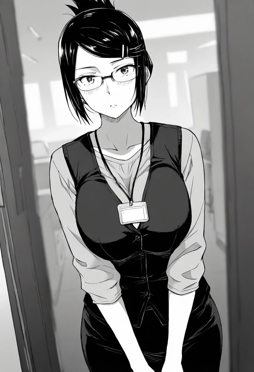 Trigger: narumi, black hair, sidelocks, long hair, folded ponytail, right-side bangs, glasses, mature female, large breasts,