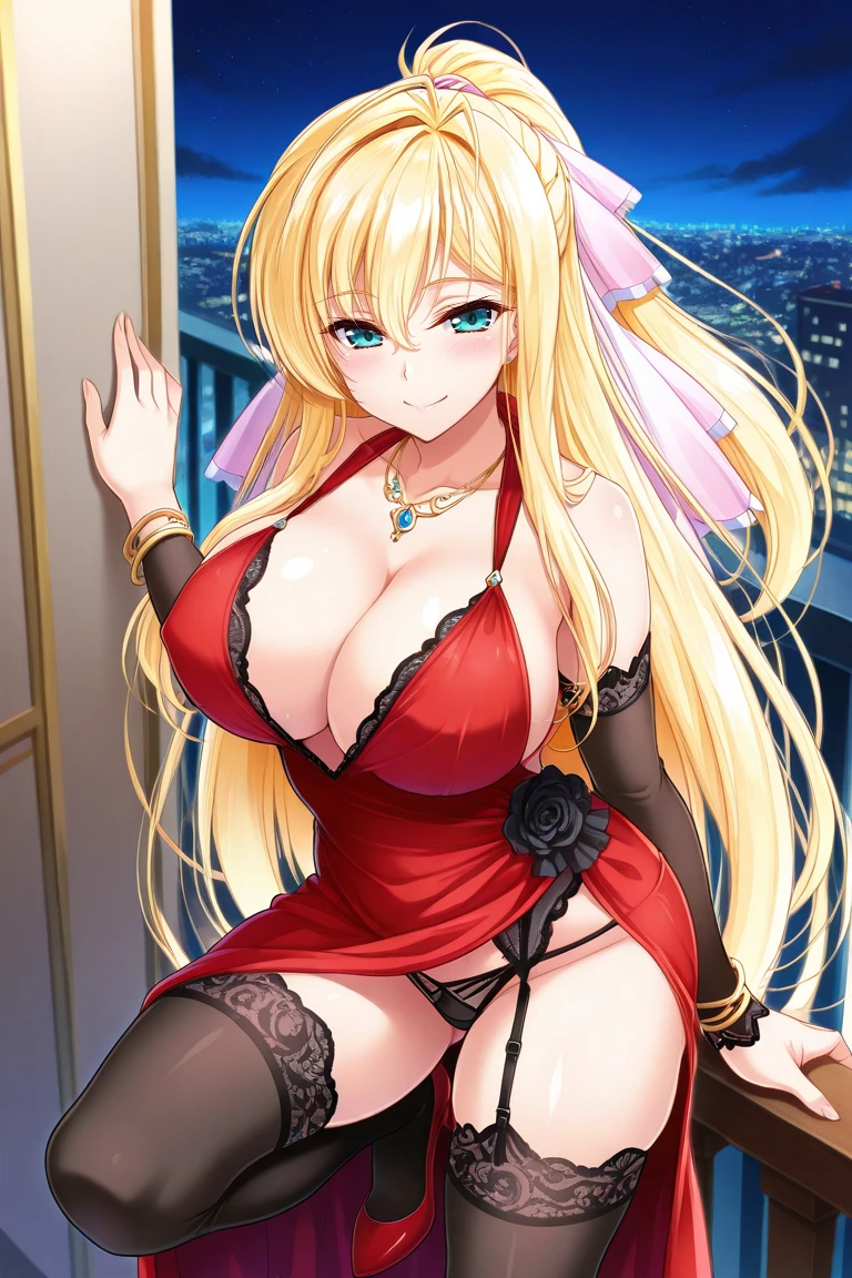 evening dress, red dress, necklace, plunging neckline, cleavage, detached sleeves, bracelets, lace-trimmed legwear, black thighhighs, garter straps, red high heels, black panties,