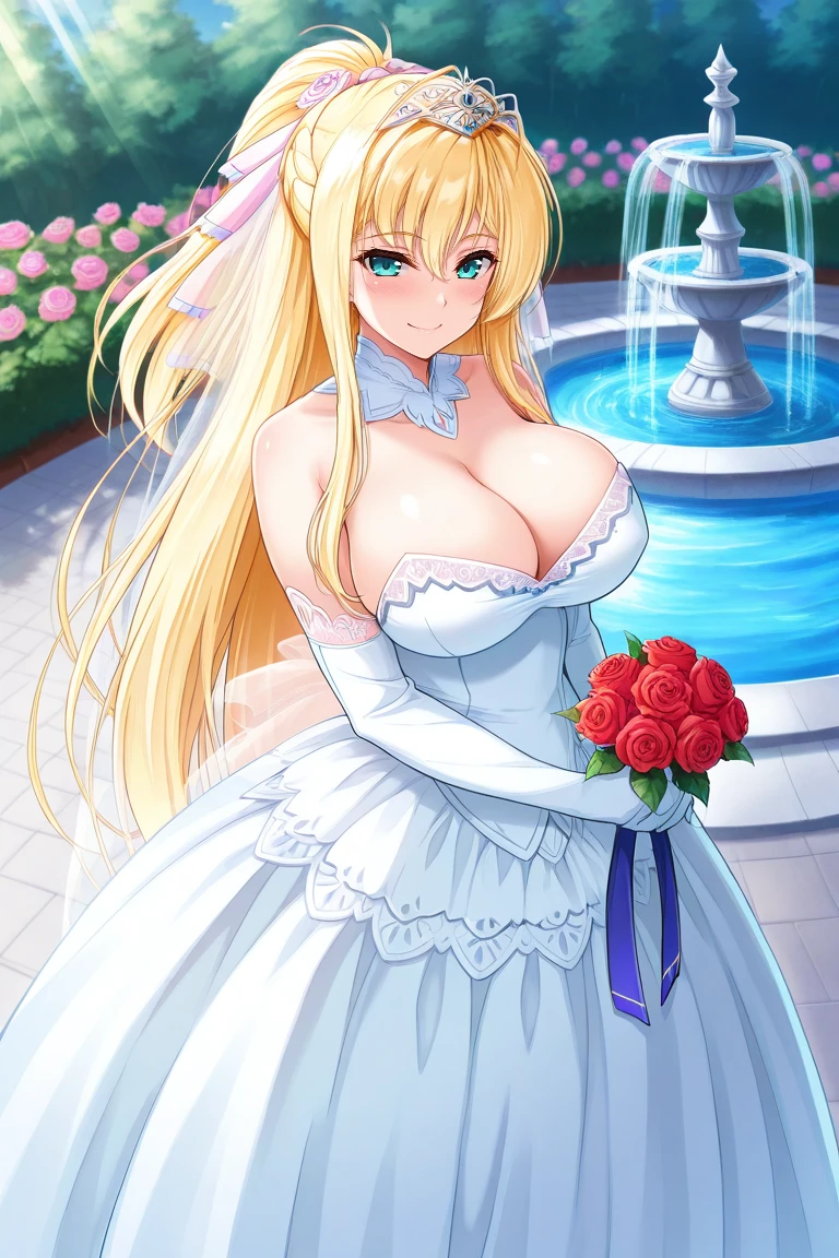 wedding dress, bridal veil, tiara, white gloves, elbow gloves, bare shoulders, cleavage, detached collar, rose, white high heels, (white thigh highs)