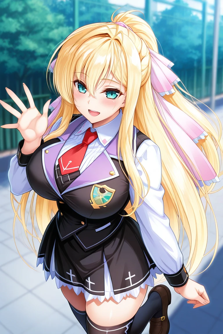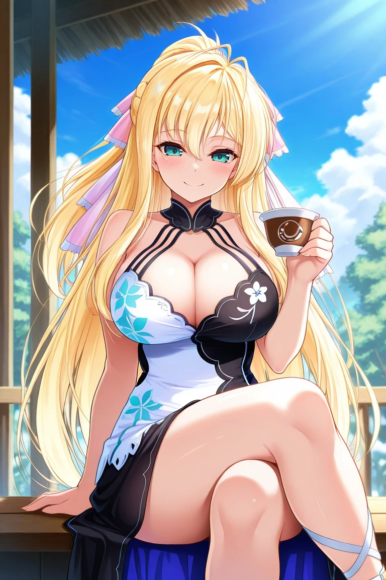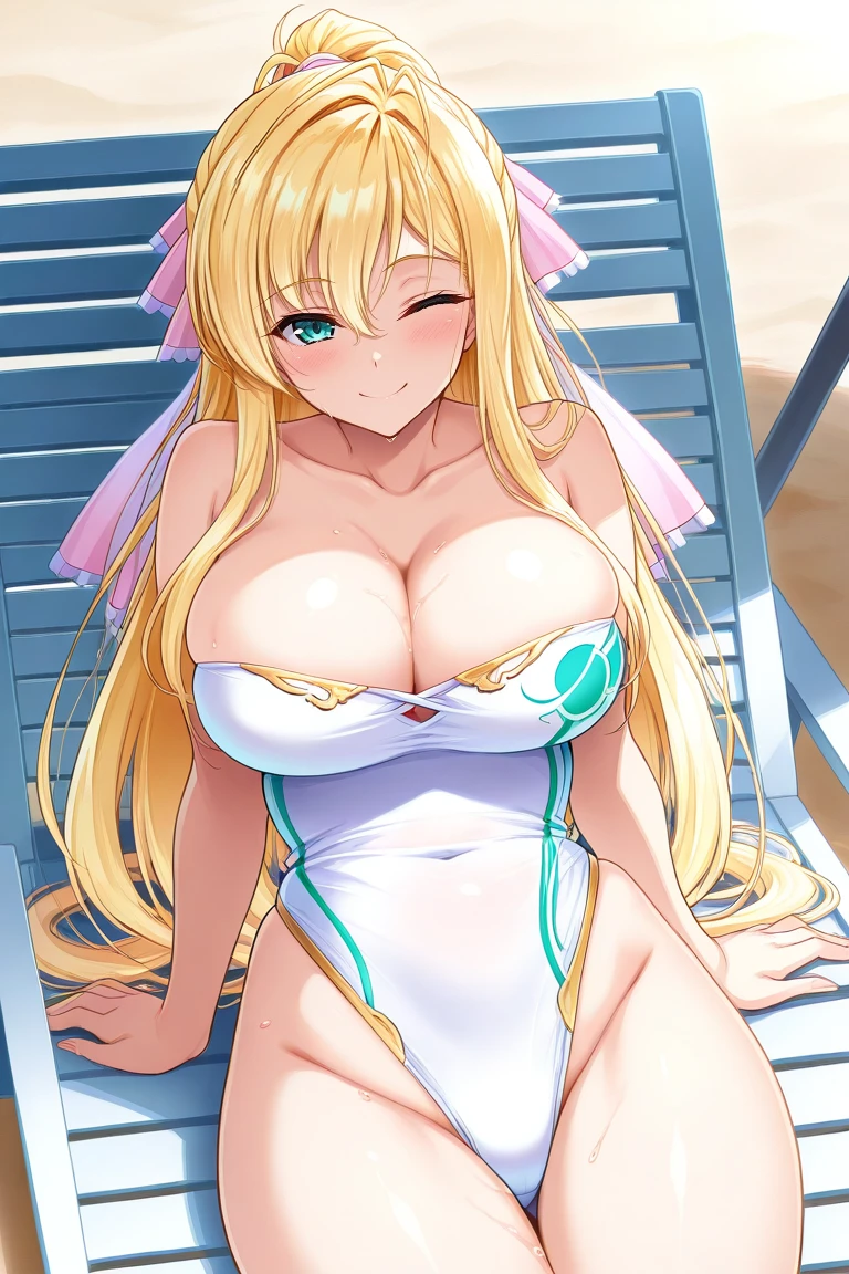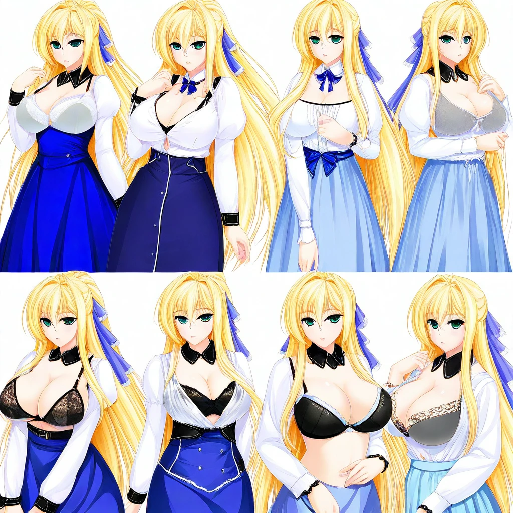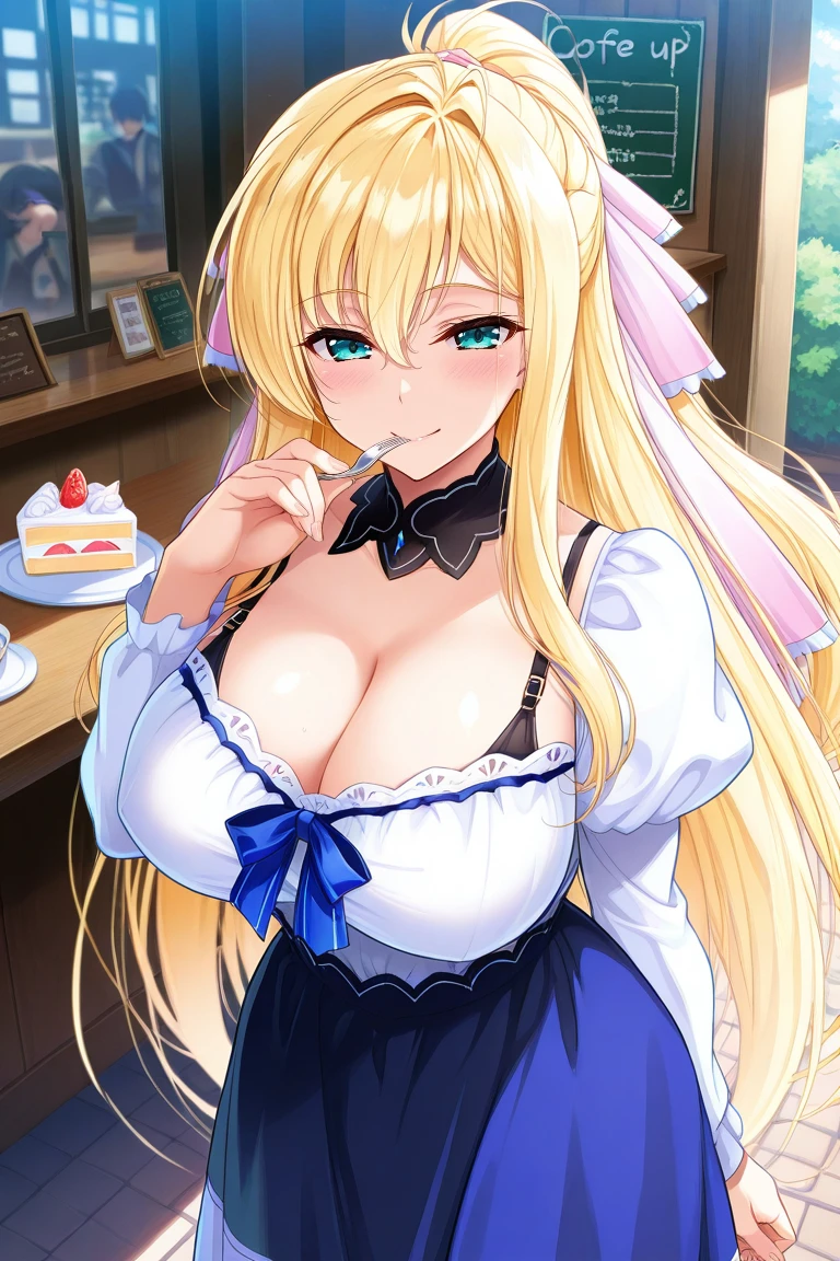 blond hair, very long hair, bangs, hair between eyes, ponytail, hair ribbon, aqua eyes, large breasts,