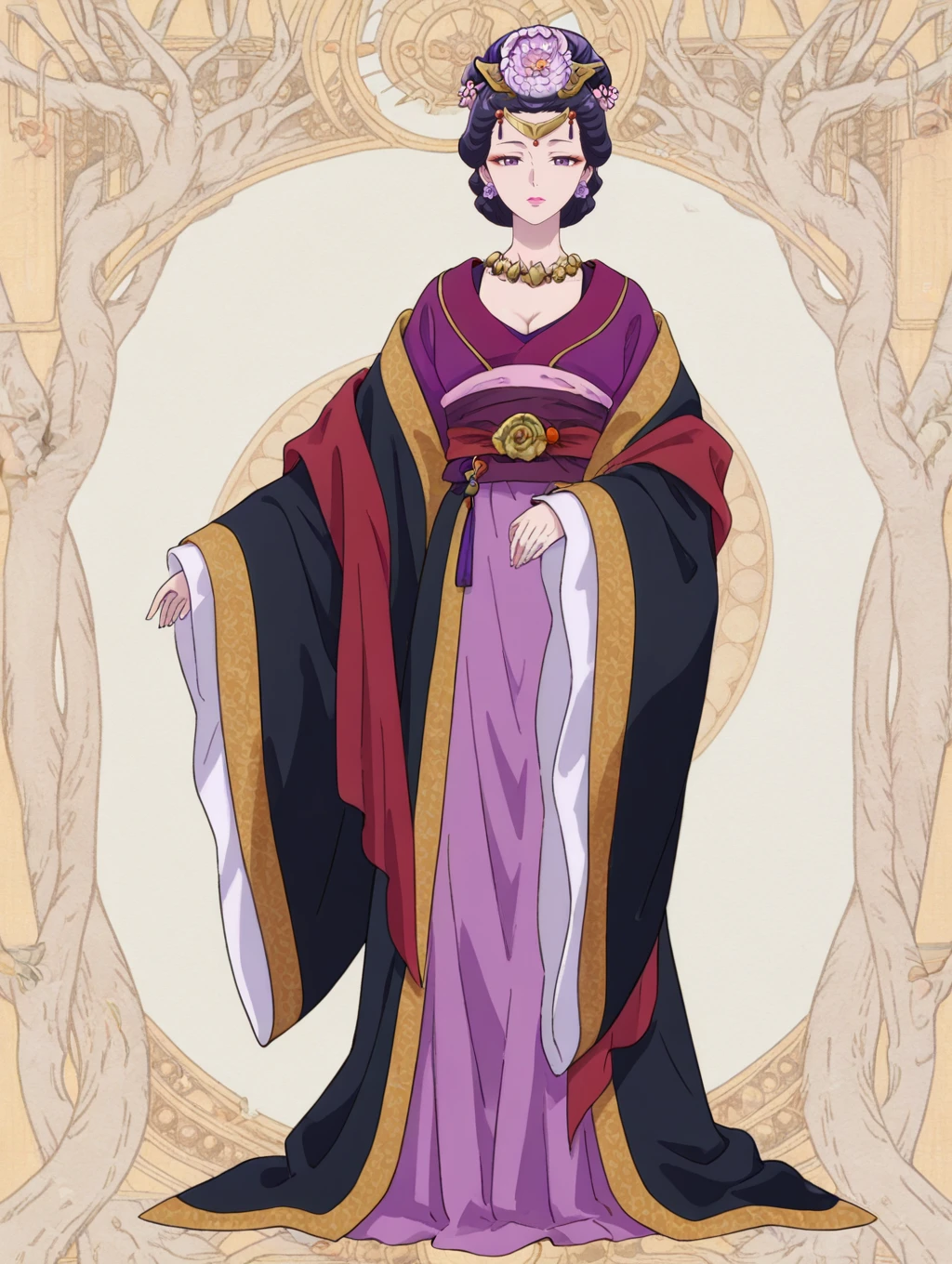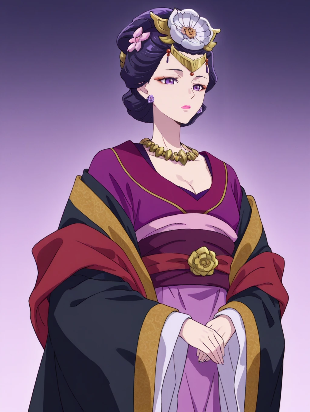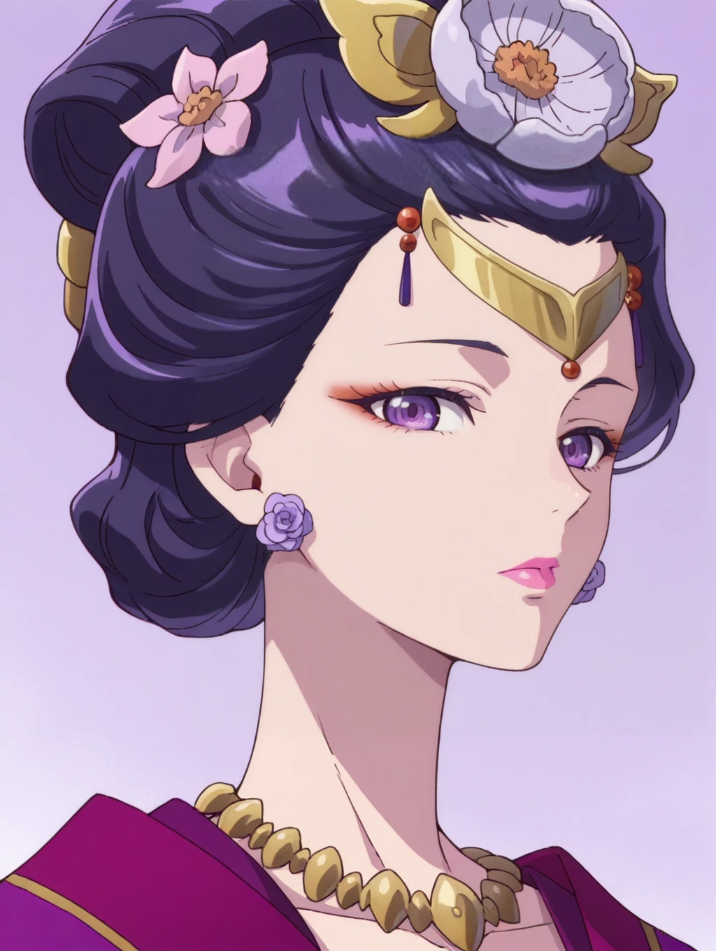 ywanshi,purple hair,hair bun,updo,purple eyes,red eyeshadow,pink lips,flower earrings,forehead jewel,hair ornament,hair flower,necklace,purple hanfu,black robe,red shawl,pink skirt,wide sleeves,red sash,golden flower,