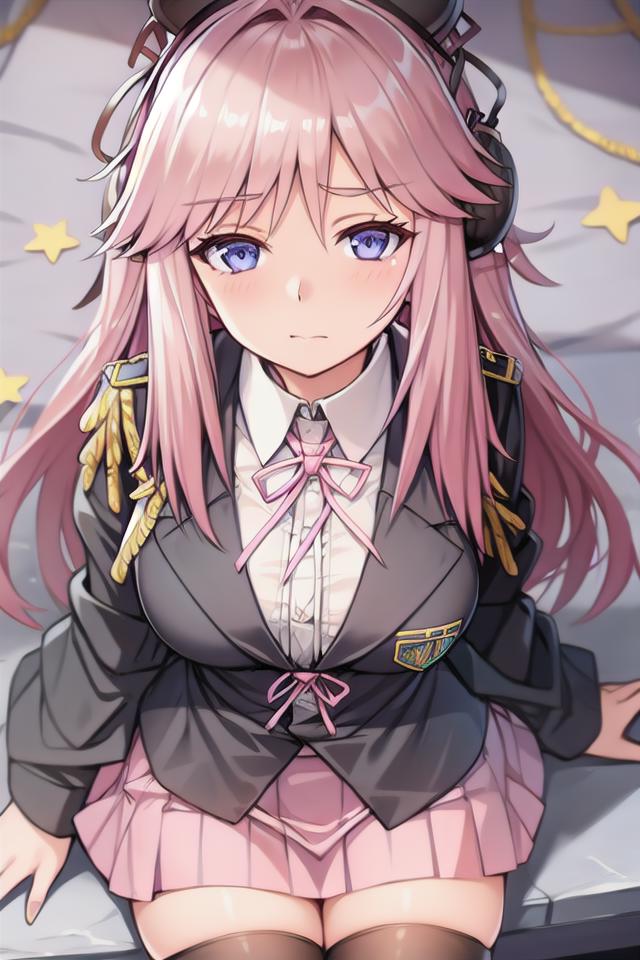 beizhai-normal, upper body,1girl, solo, thighhighs, skirt, pink skirt, boots, ,, military, black thighhighs, , zettai ryouiki, pleated skirt, uniform, breasts, jacket, looking at viewer, shirt, long sleeves,