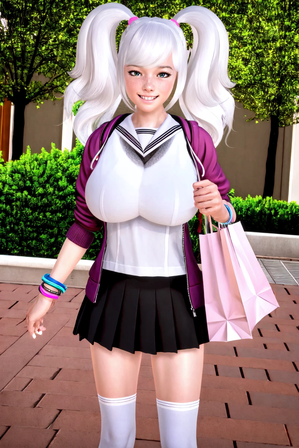 Trigger School : 1girl, long hair, twintails, school uniform, jacket, bracelet, freckles, sneaker, socks