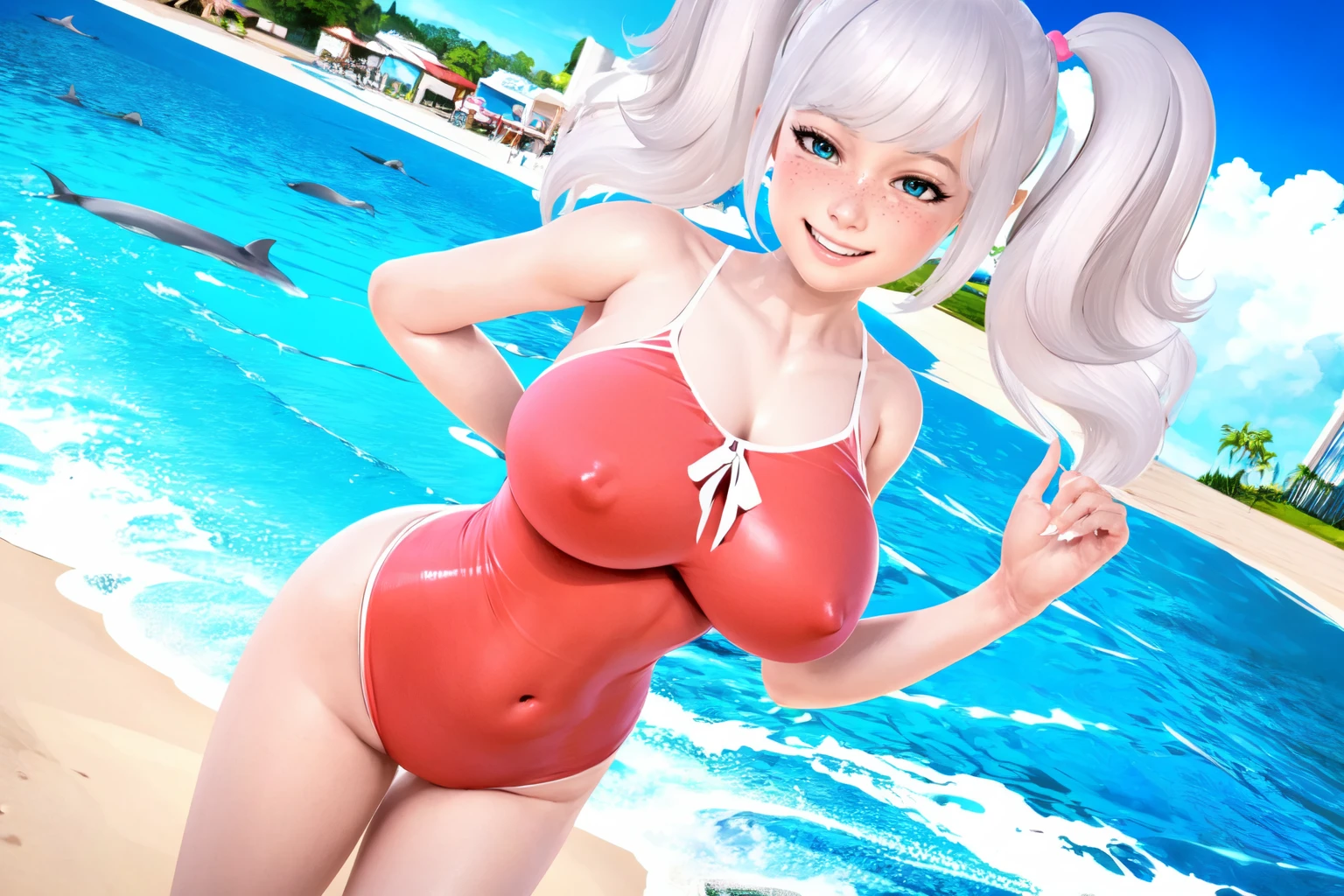 Trigger Swimsuit : 1girl, long hair, twintails, one-piece swimsuit, freckles