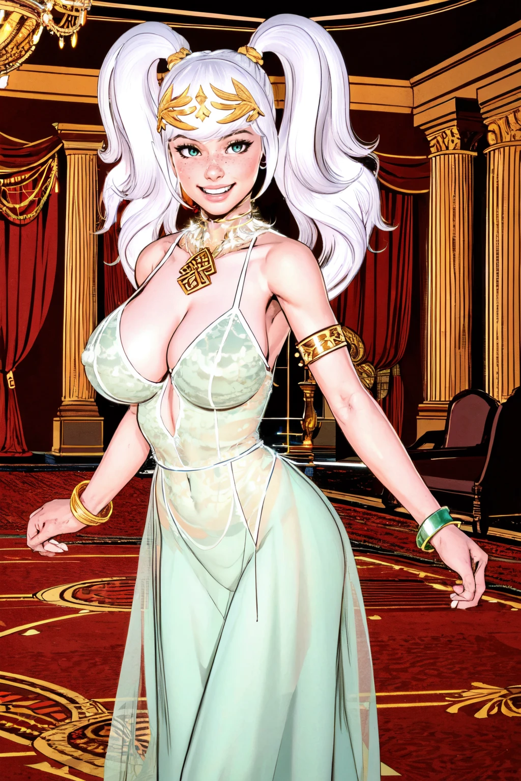 Trigger Dress Luxus : 1girl, long hair, cleavage, twintails, jewelry, bracelet, see-through, tiara, veil, armlet, gown, pumps , freckles