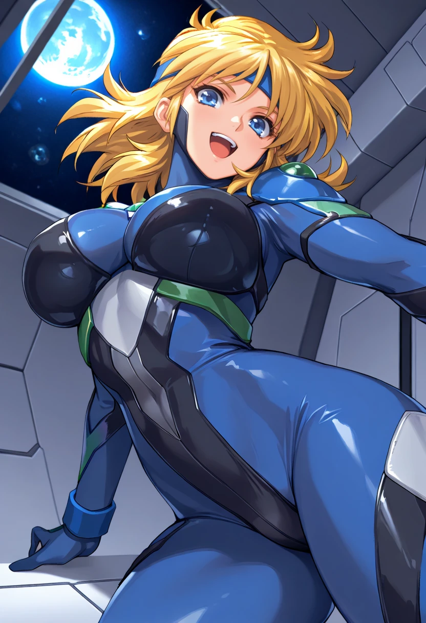 blue bodysuit, pilot suit, skin tight, large breasts, blonde hair, bangs, blue headband, medium hair, blue eyes