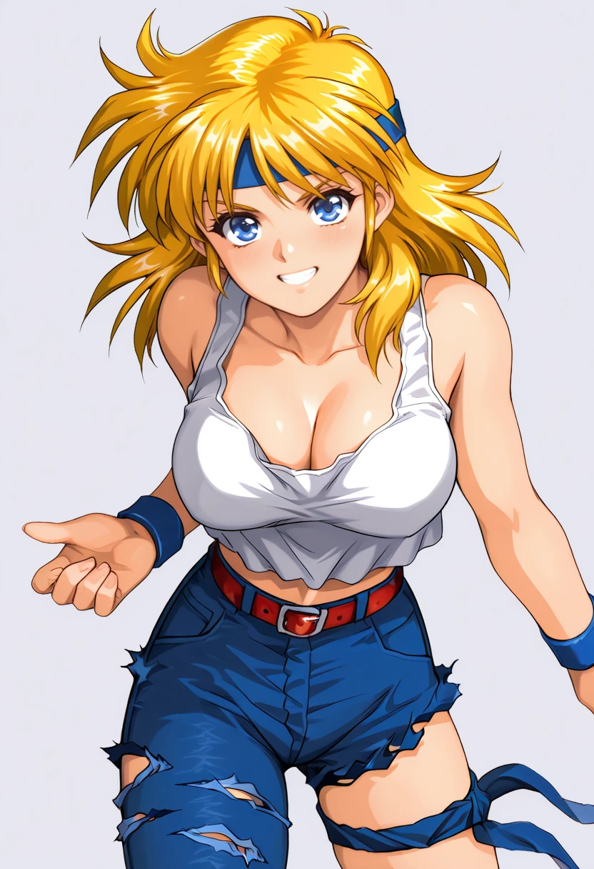 white tank top, belt, torn jeans, asymmetrical legwear, thigh strap, midriff, wristbands, large breasts, cleavage, blonde hair, bangs, blue headband, medium hair, blue eyes