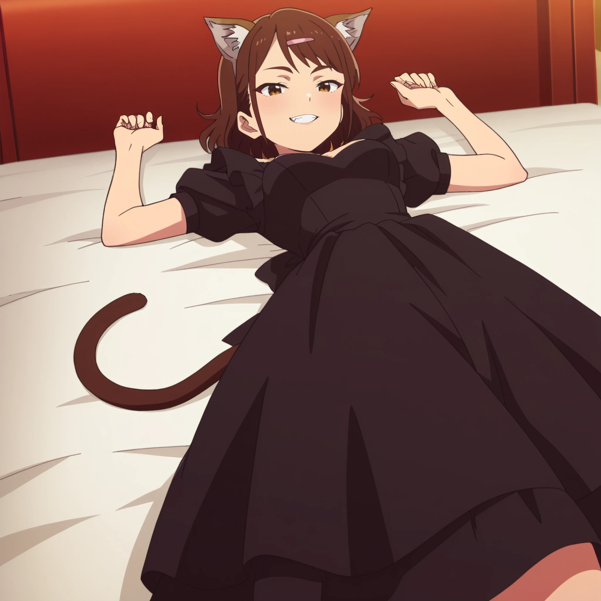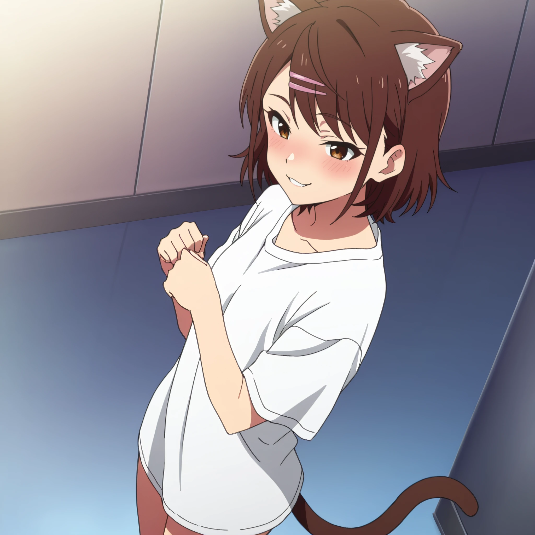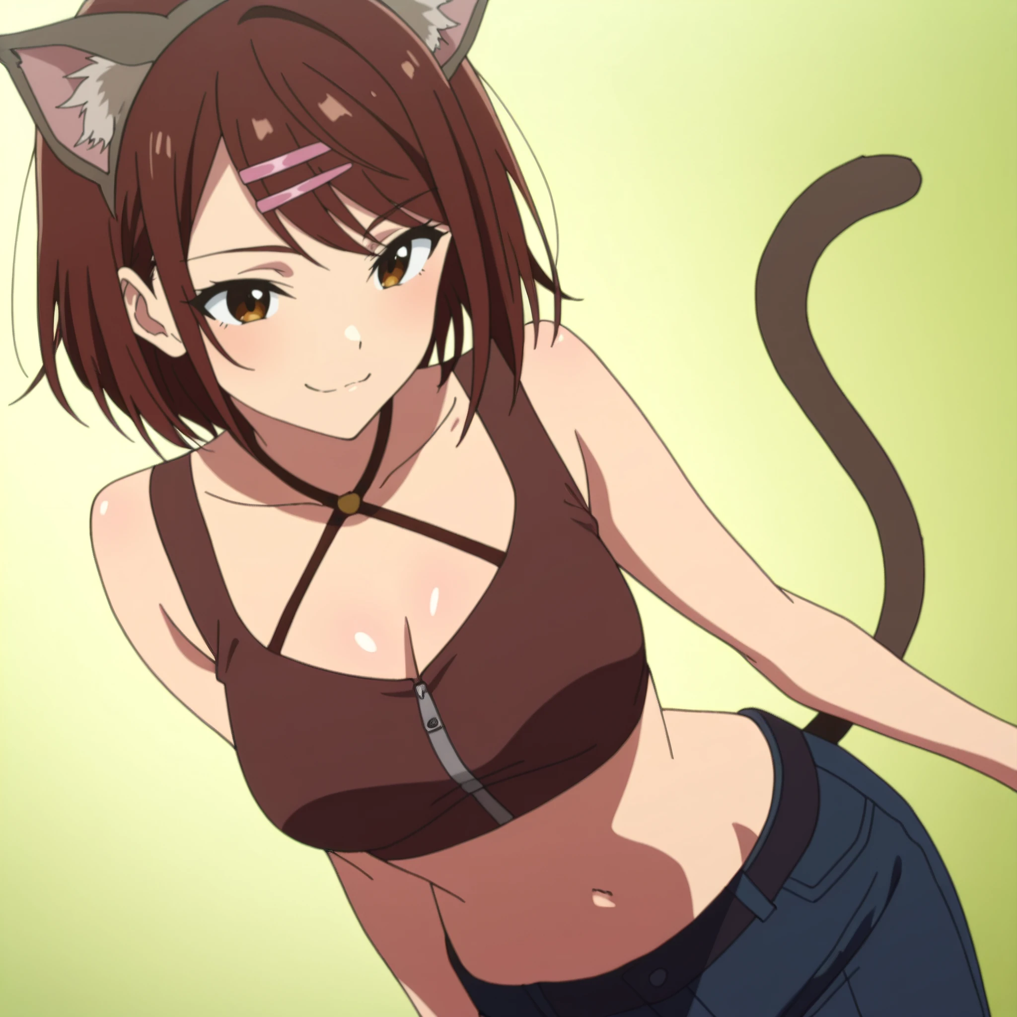 AMWCat, brown hair, animal ears, cat ears, short hair, eyebrows visible through hair, long hair, brown eyes, cat tail, tail,