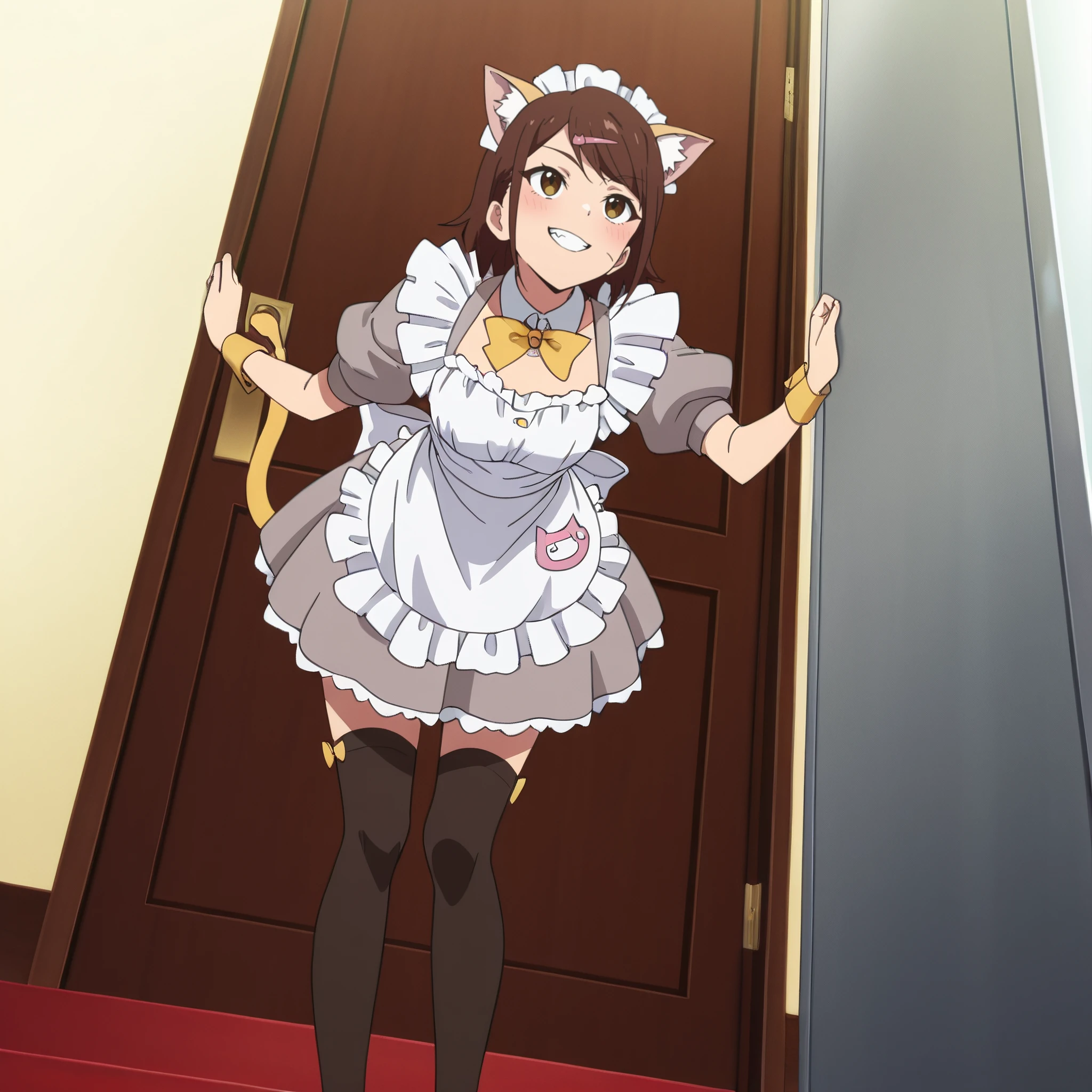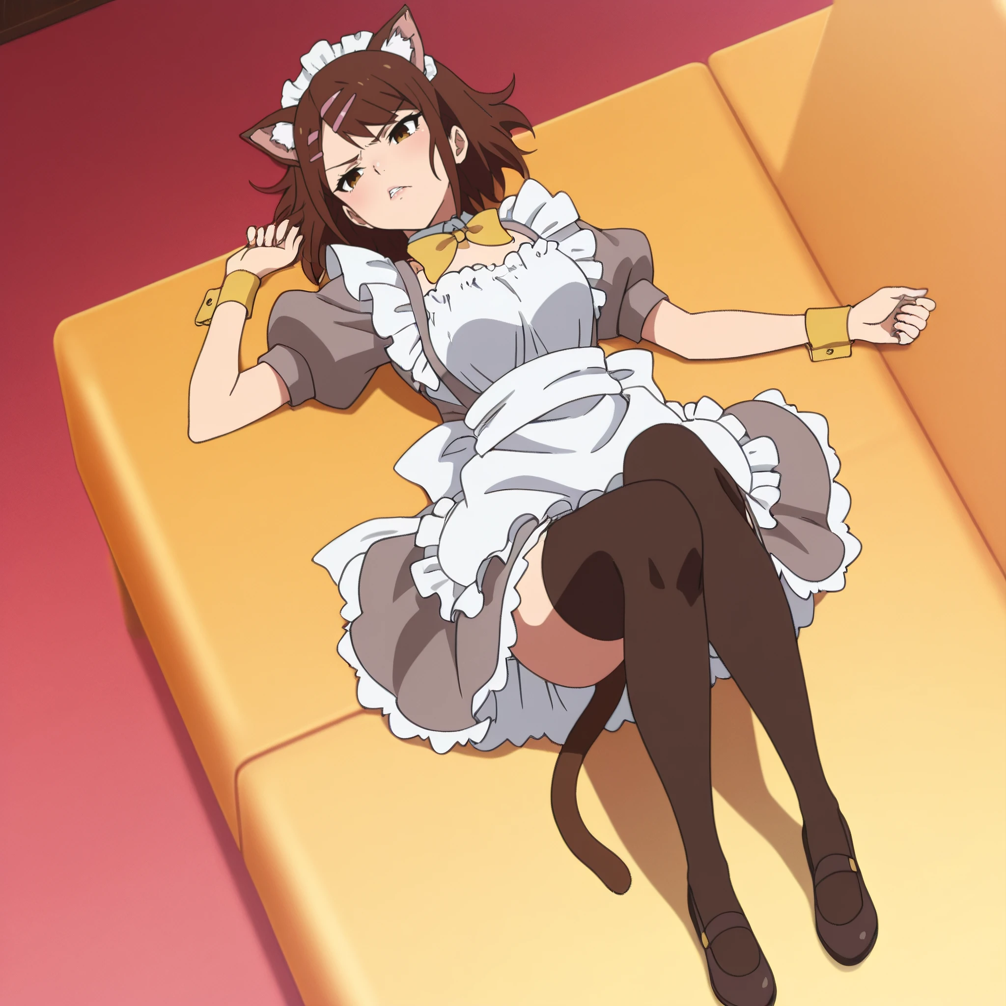 apron, maid, maid headdress, dress, enmaided, maid apron, frills, puffy short sleeves, white apron, bow, hair ornament, puffy sleeves, short sleeves, hairclip, thighhighs, yellow bow, frilled apron, black legwear,