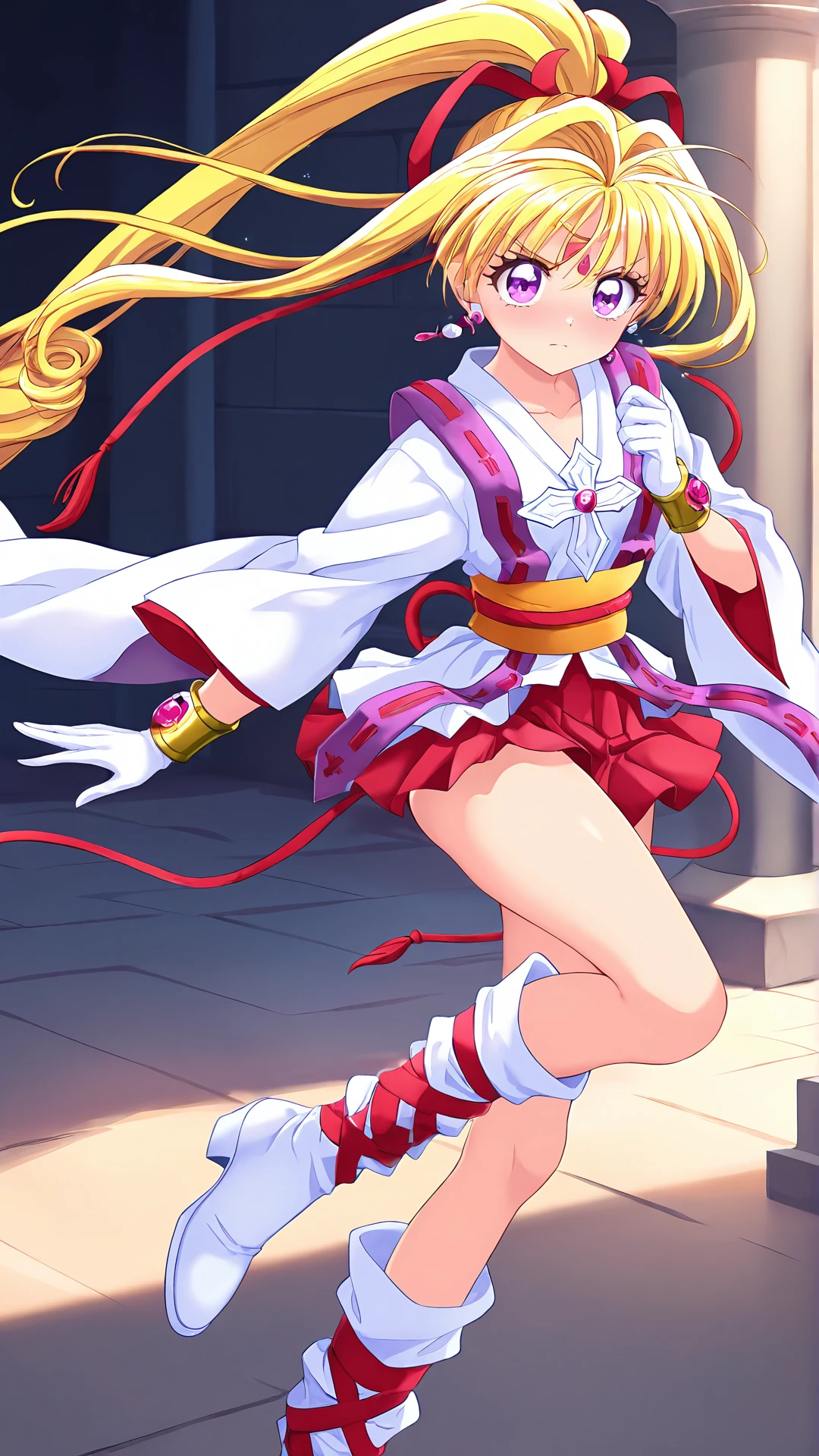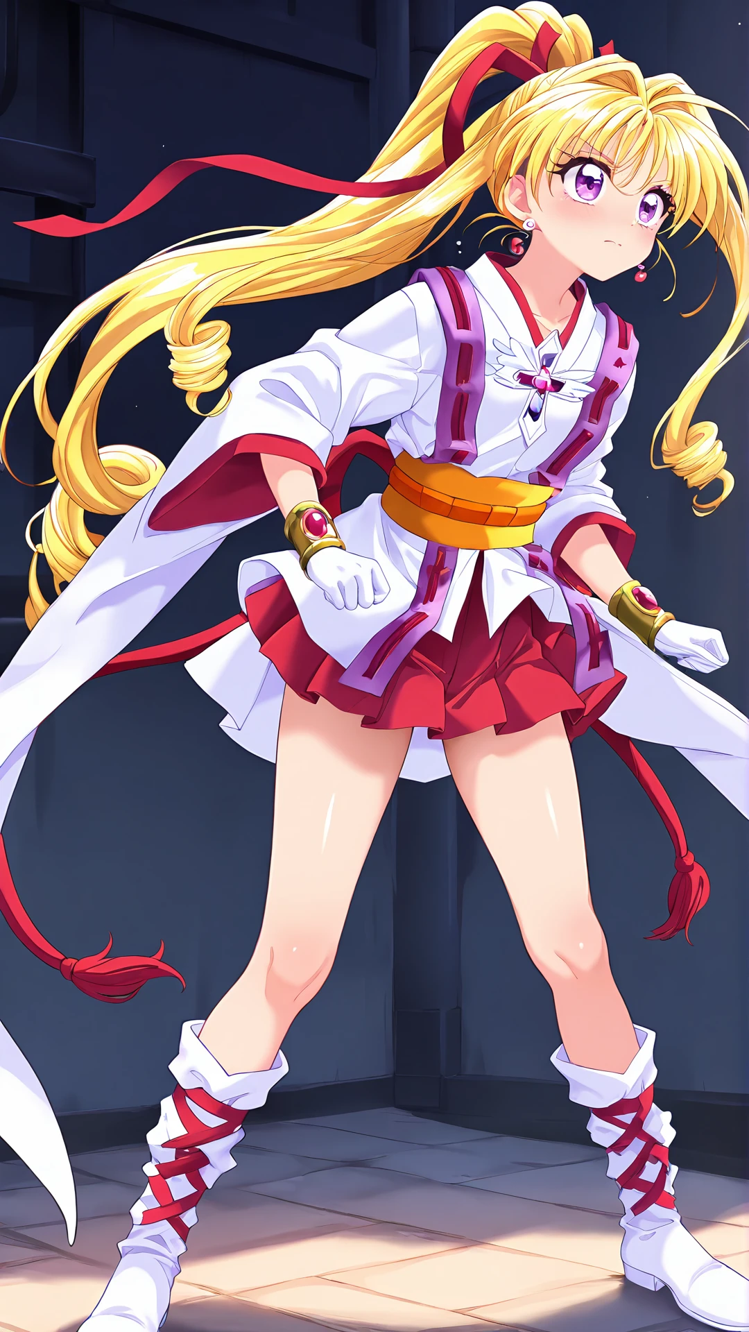 PhantomJeanne, 1girl, solo, blonde hair, jewelry, gloves, white footwear, skirt, boots, long hair, red skirt, , earrings, purple eyes, ponytail,, sash, white gloves, magical girl, pleated skirt, , high ponytail, bracelet, wide sleeves, , ribbon, cross, obi