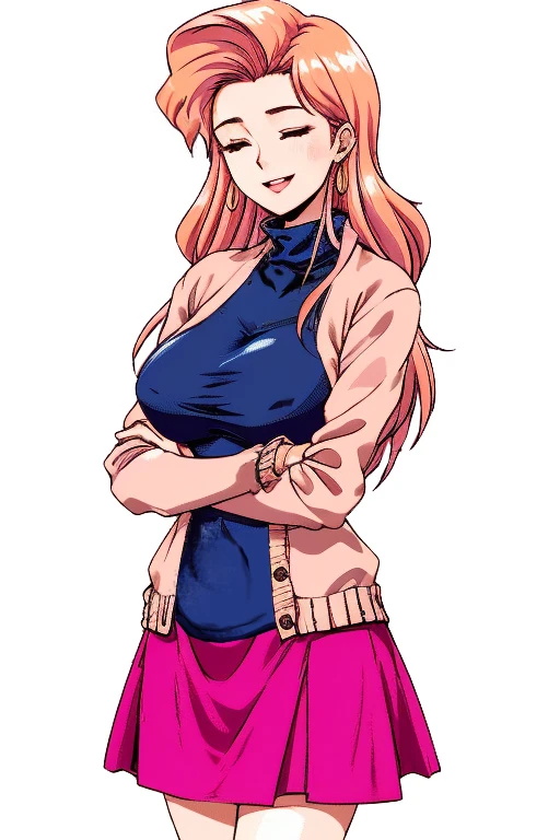 long hair, blonde hair, large breasts, cleavage, casual, turtleneck, orange cardigan, open cardigan, pink shirt, long skirt, blue skirt, boots,