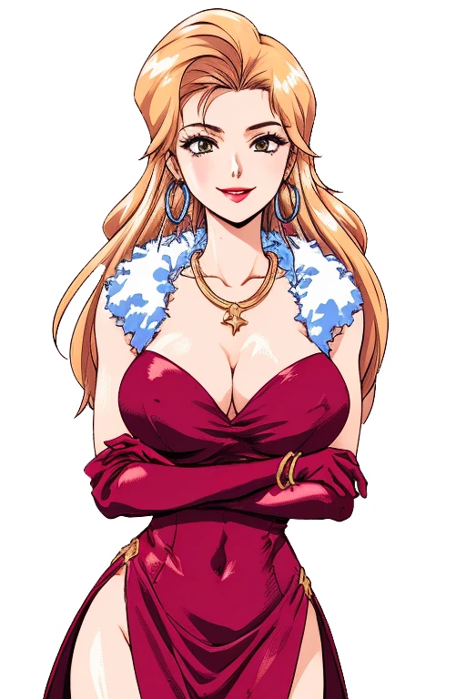 sleeveless_dress, red dress, elbow gloves, red gloves, feather boa,
