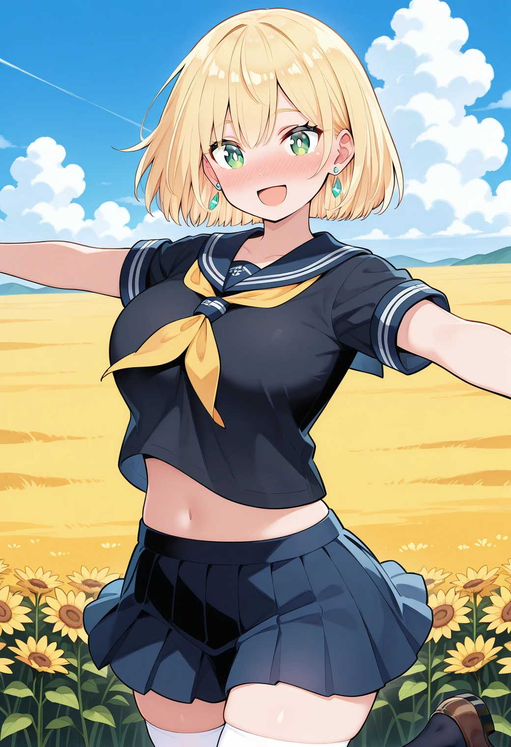 costume3: midriff, navel, school uniform, blue serafuku, short sleeves, pleated skirt, white thighhighs, zettai ryouiki,