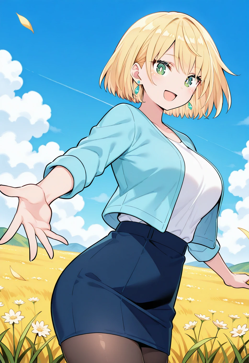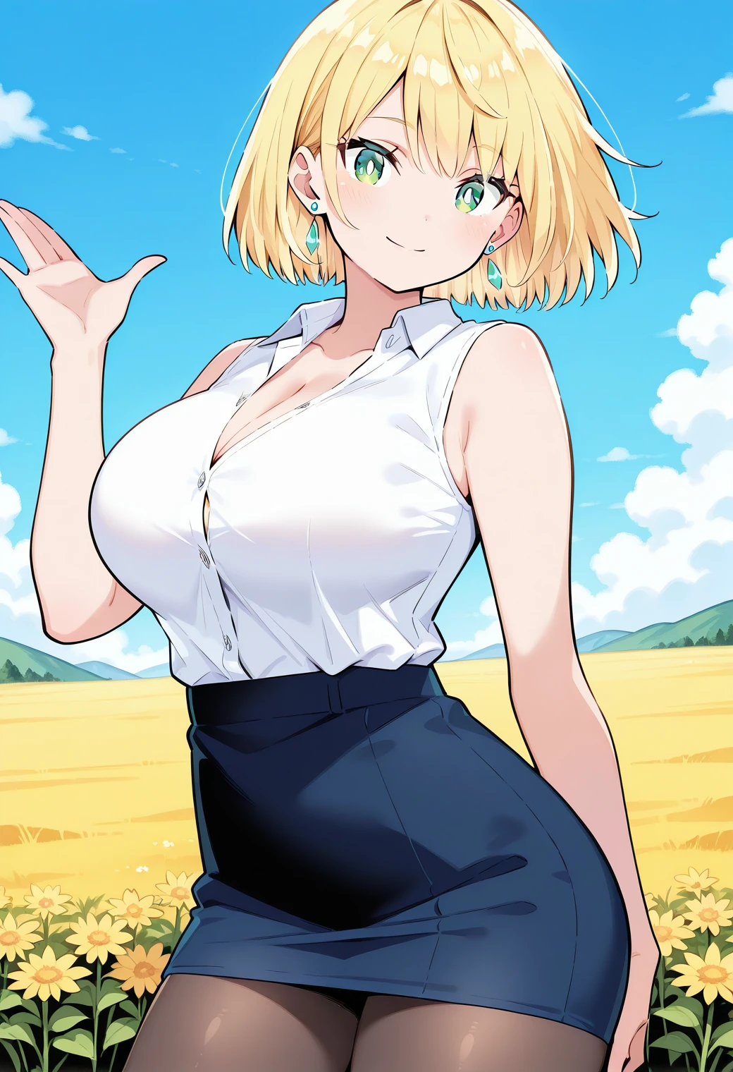 takinami_remon, green eyes, blonde hair, short hair, earrings, cleavage, white shirt, collared shirt, sleeveless, pencil skirt, blue skirt, pantyhose,