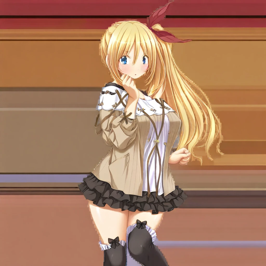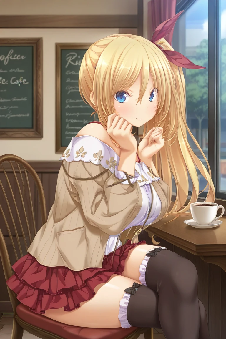 riz-casual, side ponytail, layered shoulder, long sleeves, frilled skirt, black thighhighs,