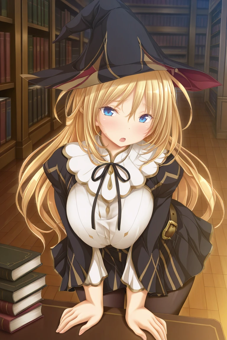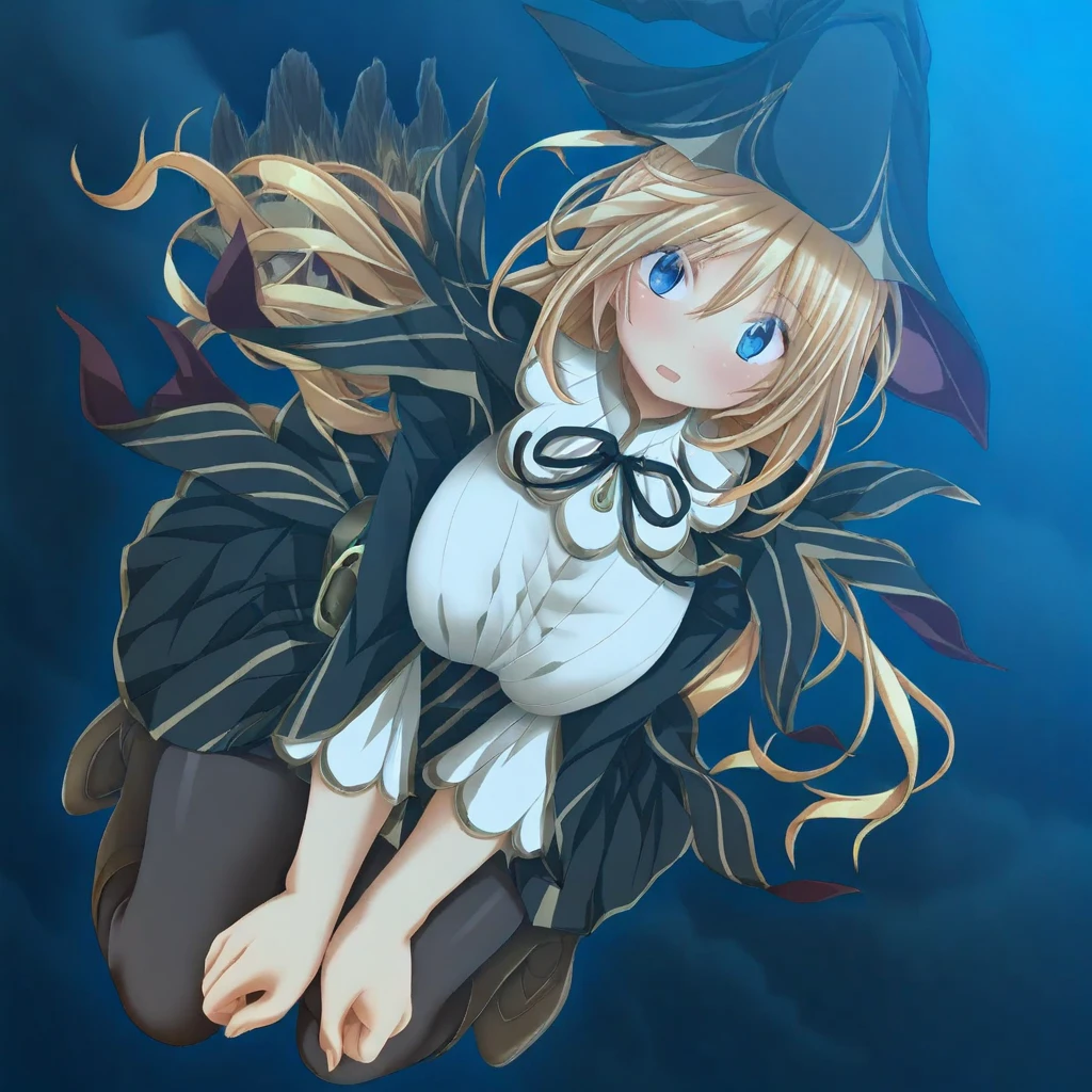 riz-wizard, black dress, long sleeves, white collar, black bow, pantyhose, witch hat,