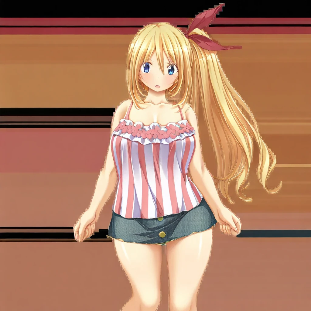 riz-tanktop, side ponytail, tank top, spaghetti straps, vertical stripes, denim skirt, miniskirt,