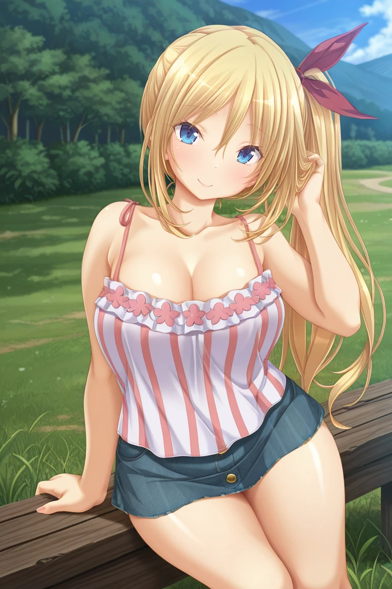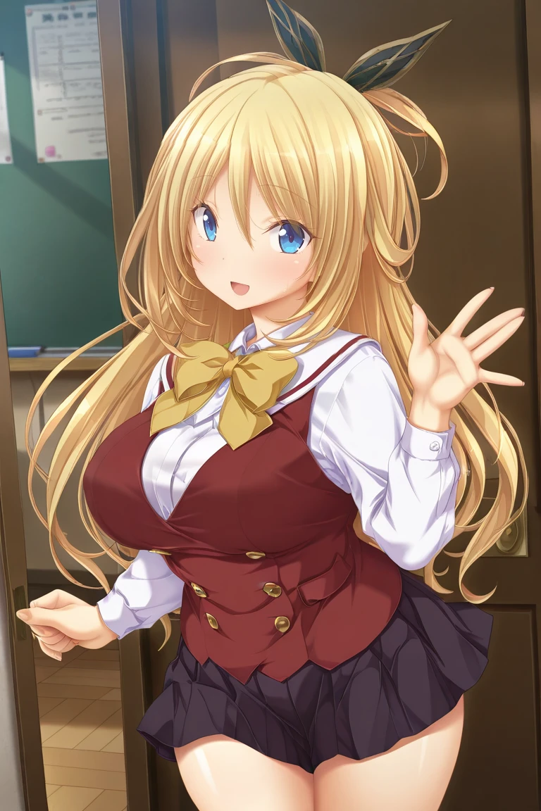 blond hair, very long hair, hair bow, bangs, hair between eyes, blue eyes, large breasts,