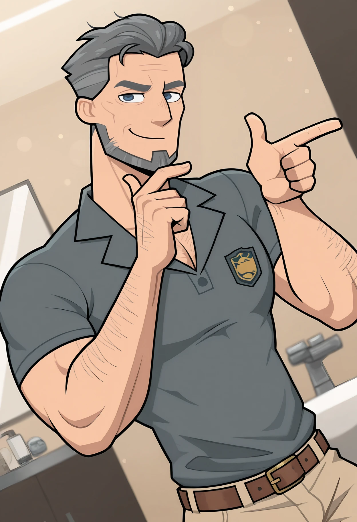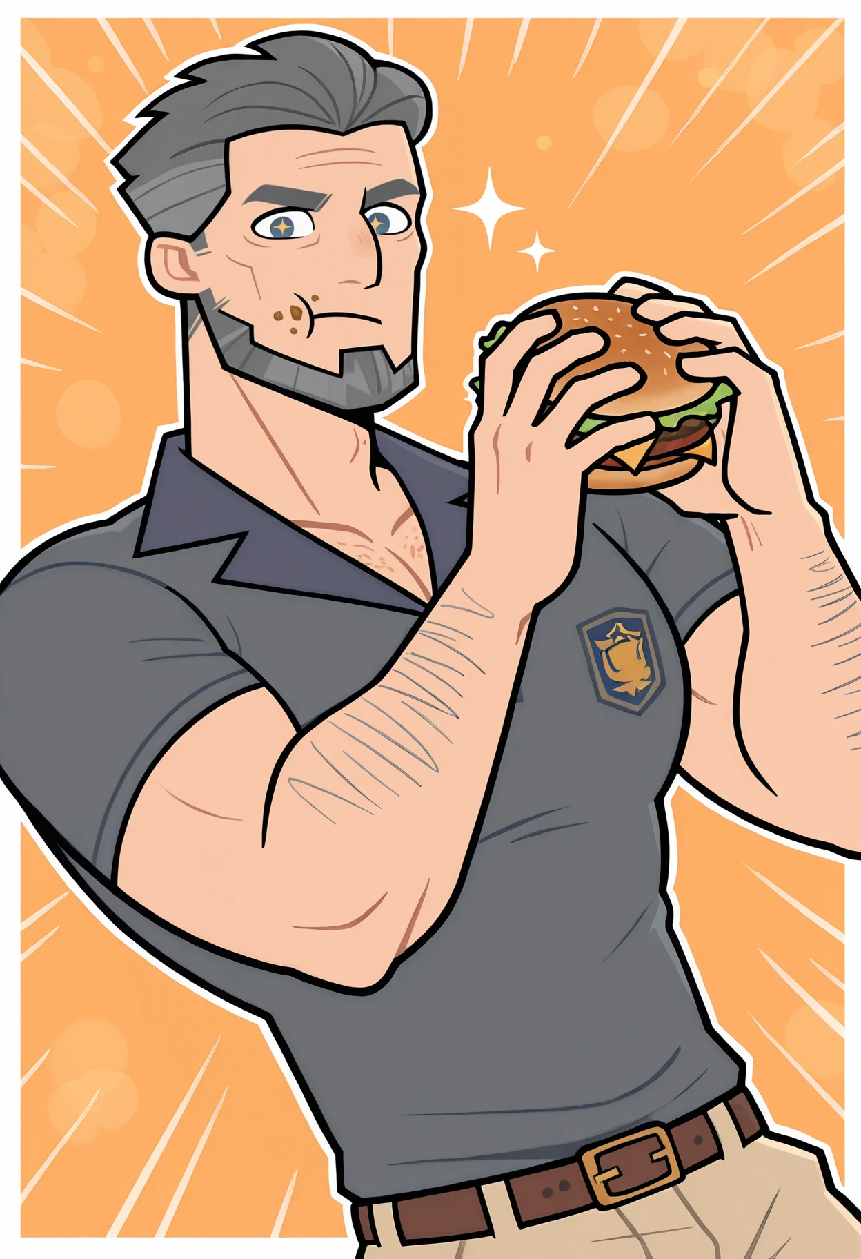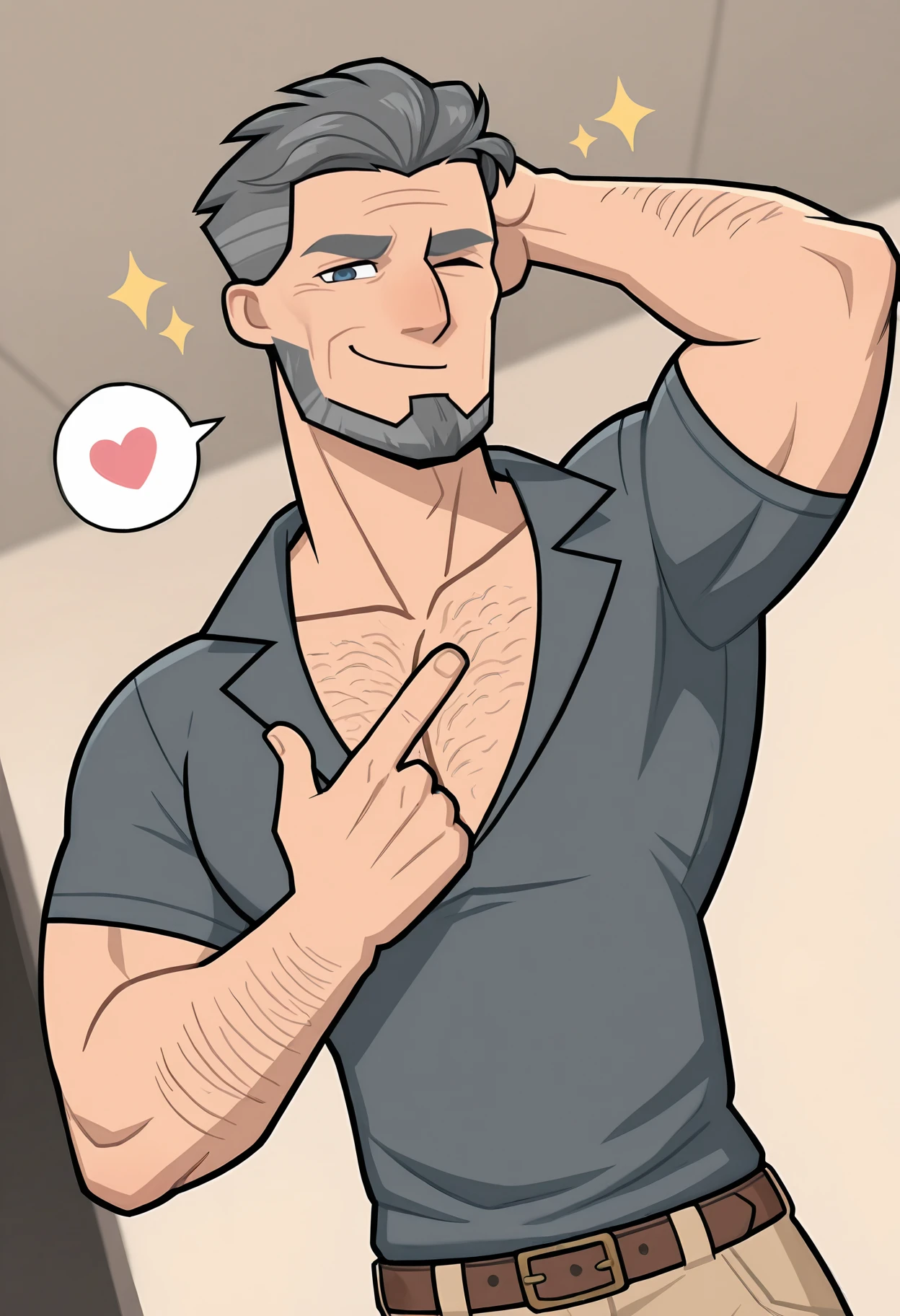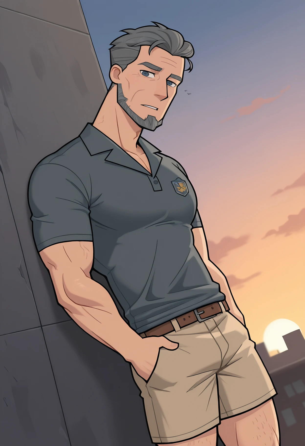 Connor, male, muscular, grey hair, short hair, beard, facial hair, blue eyes, tan skin, grey beard, wrinkles
