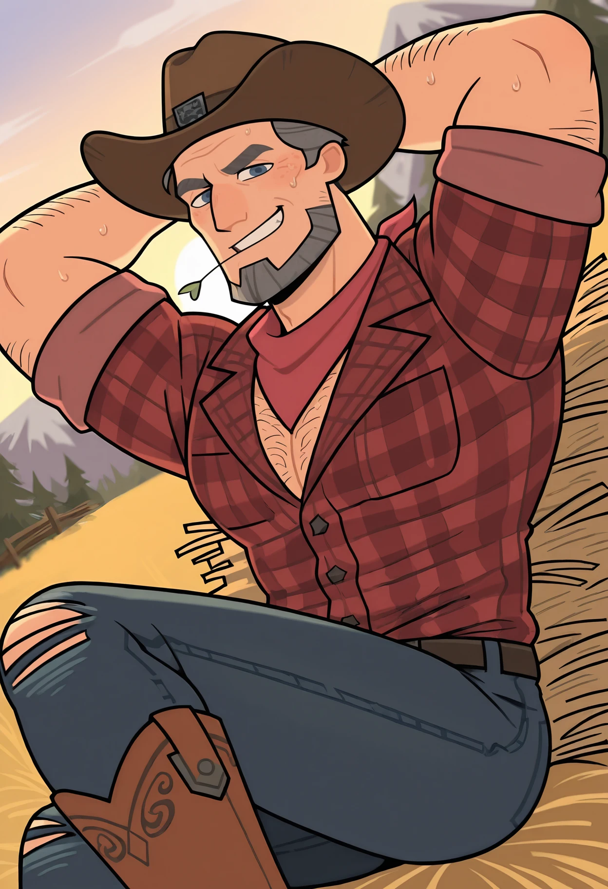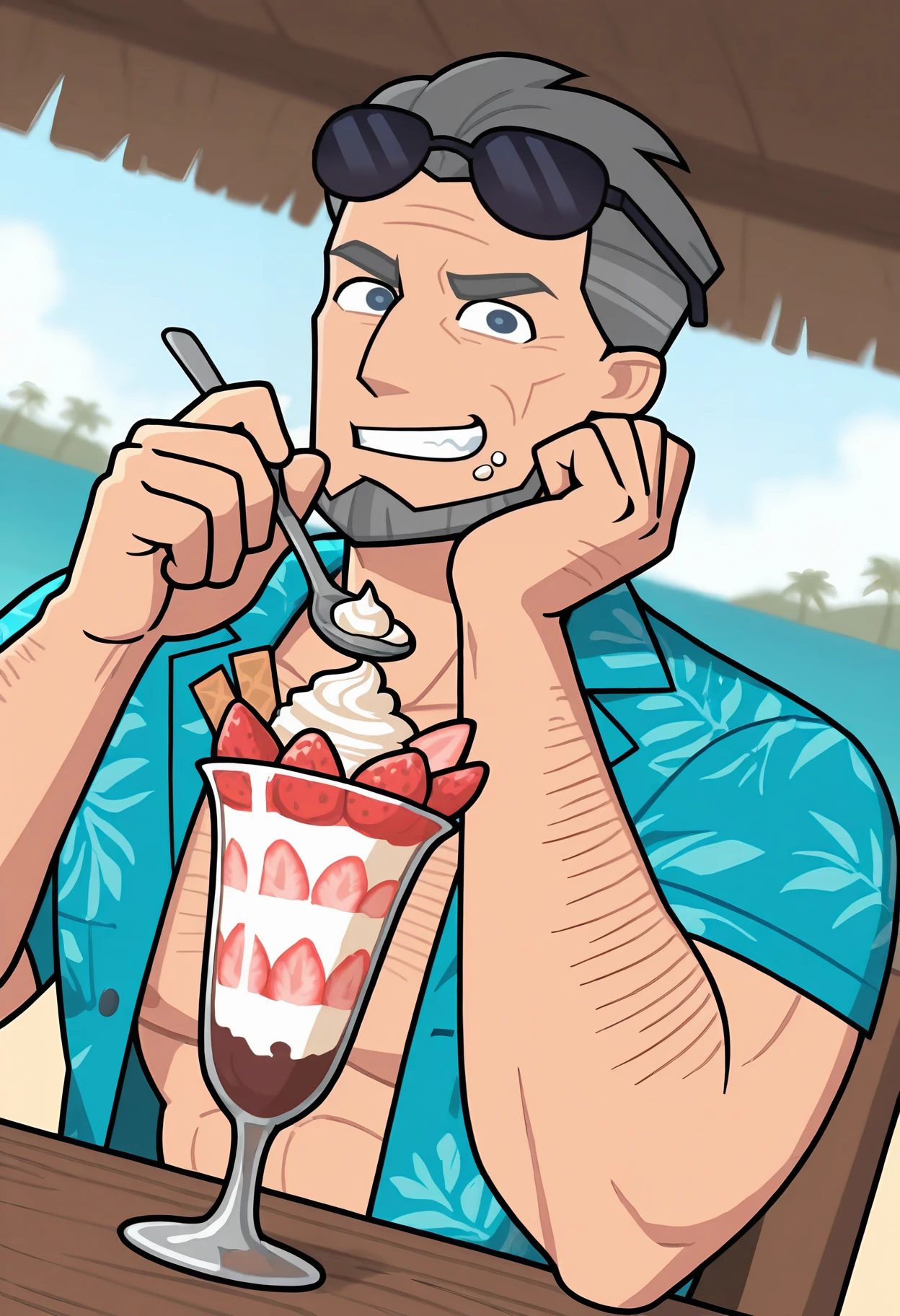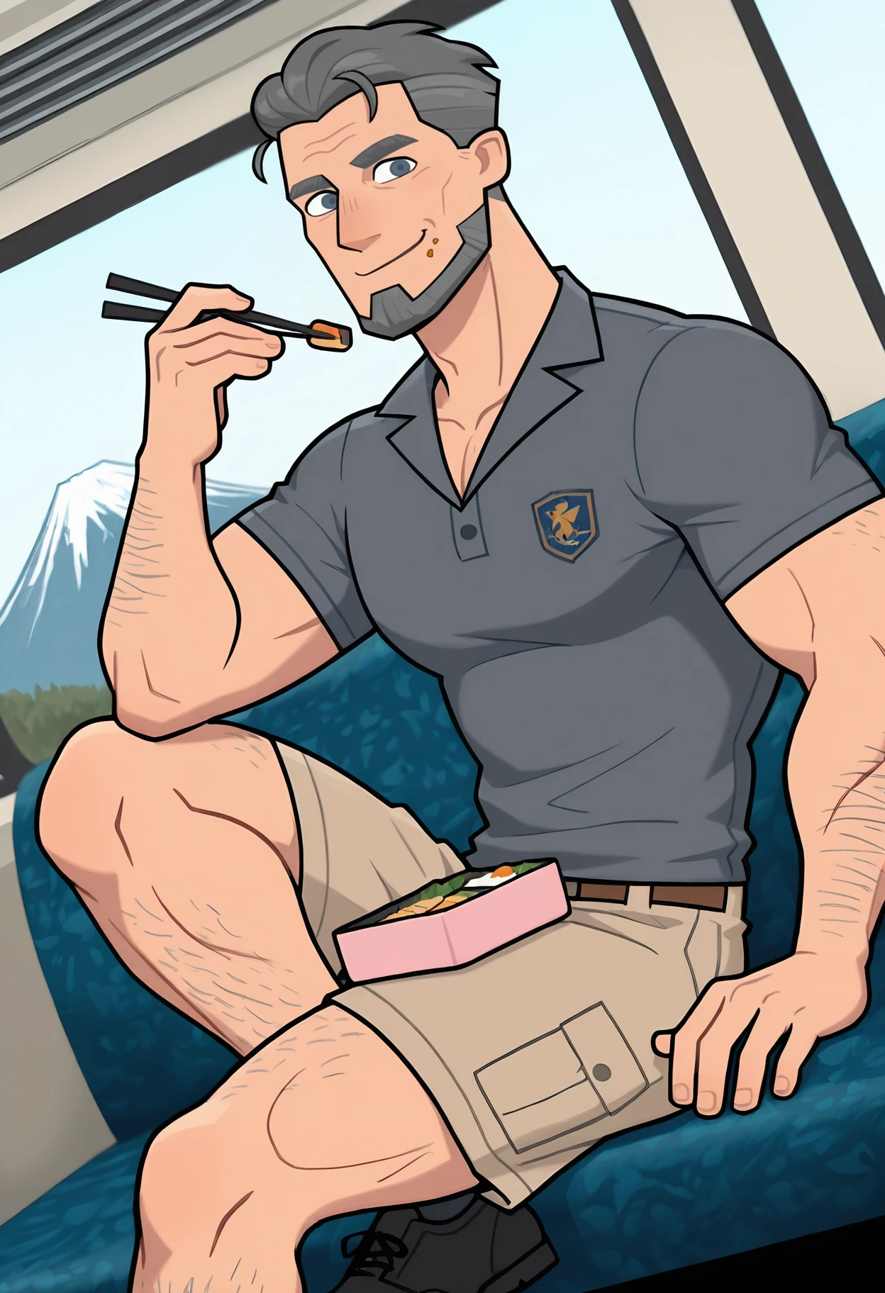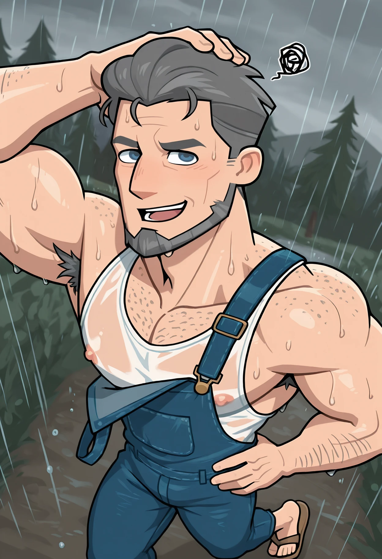 Connor, male, muscular, grey hair, short hair, beard, facial hair, blue eyes, tan skin, grey beard, wrinkles