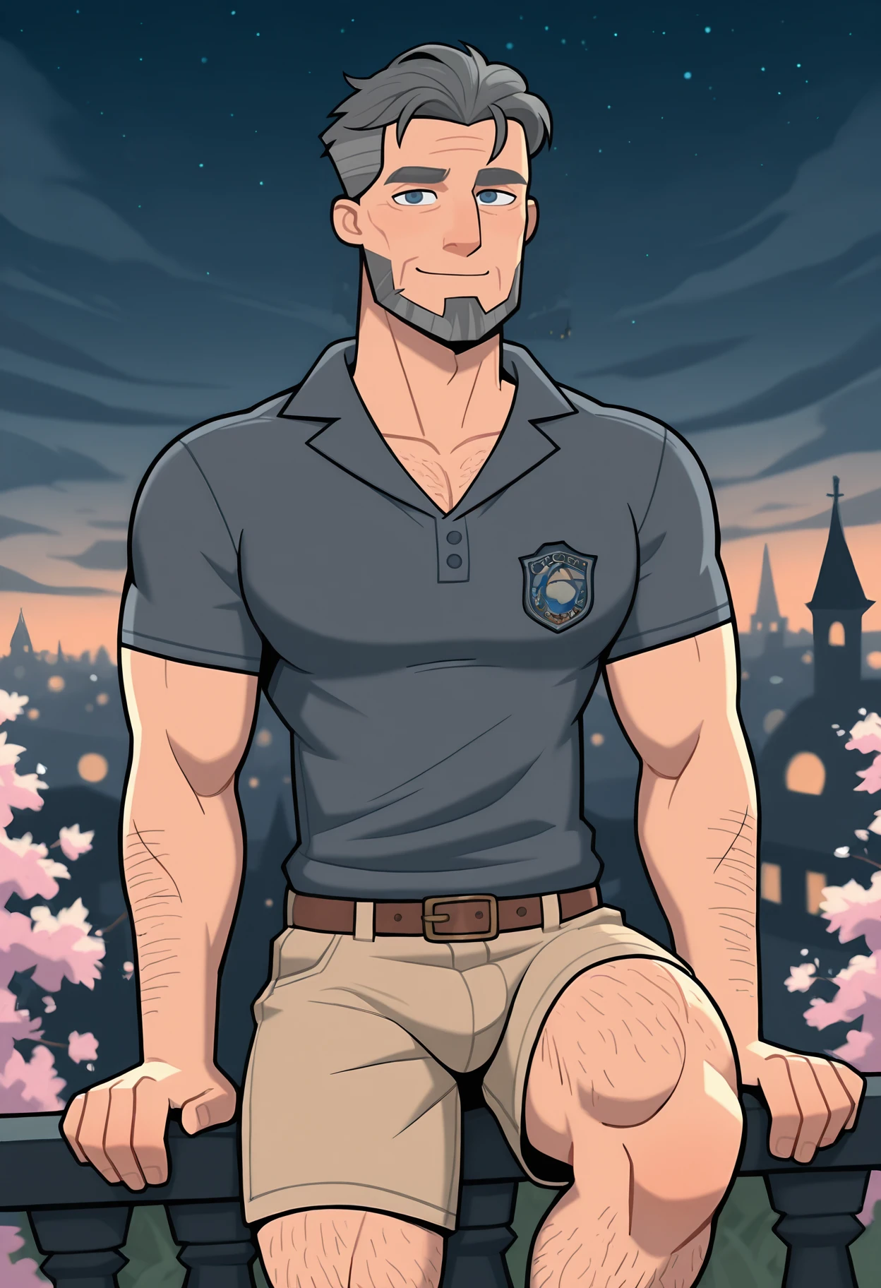 purple polo shirt, short sleeves, open collar, khaki shorts, brown belt, black shoes